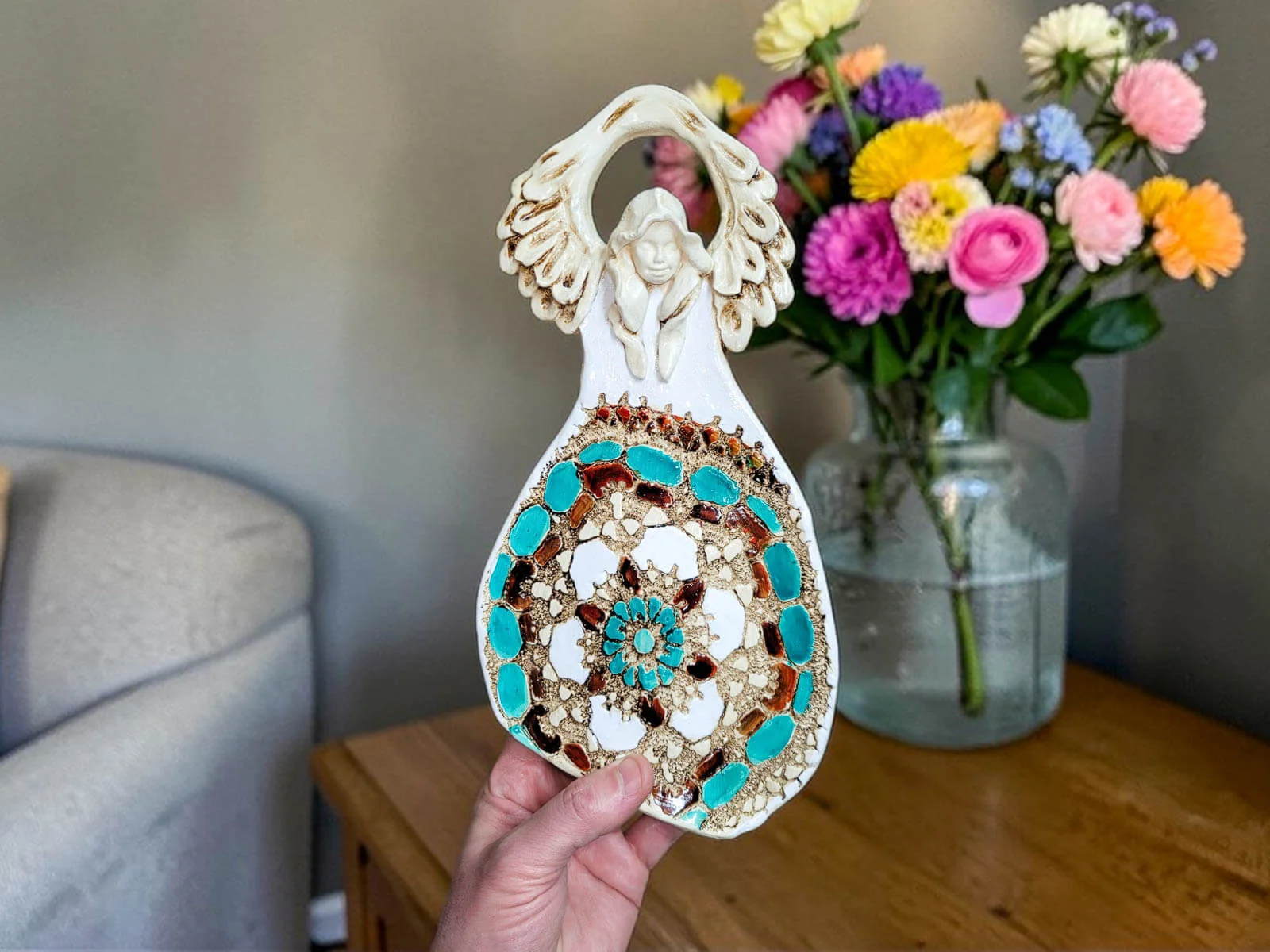 Jeśli anioł ma zostać wręczony jako prezent możemy go również elegancko zapakować w przeźroczysty celofan wiązany ekologicznym sznurkiem. Dzięki temu anioł będzie wyglądał jeszcze bardziej dostojnie i będzie gotowy do wręczenia. Dla wygody możesz również od razu zakupić papierową białą torbę prezentową.
