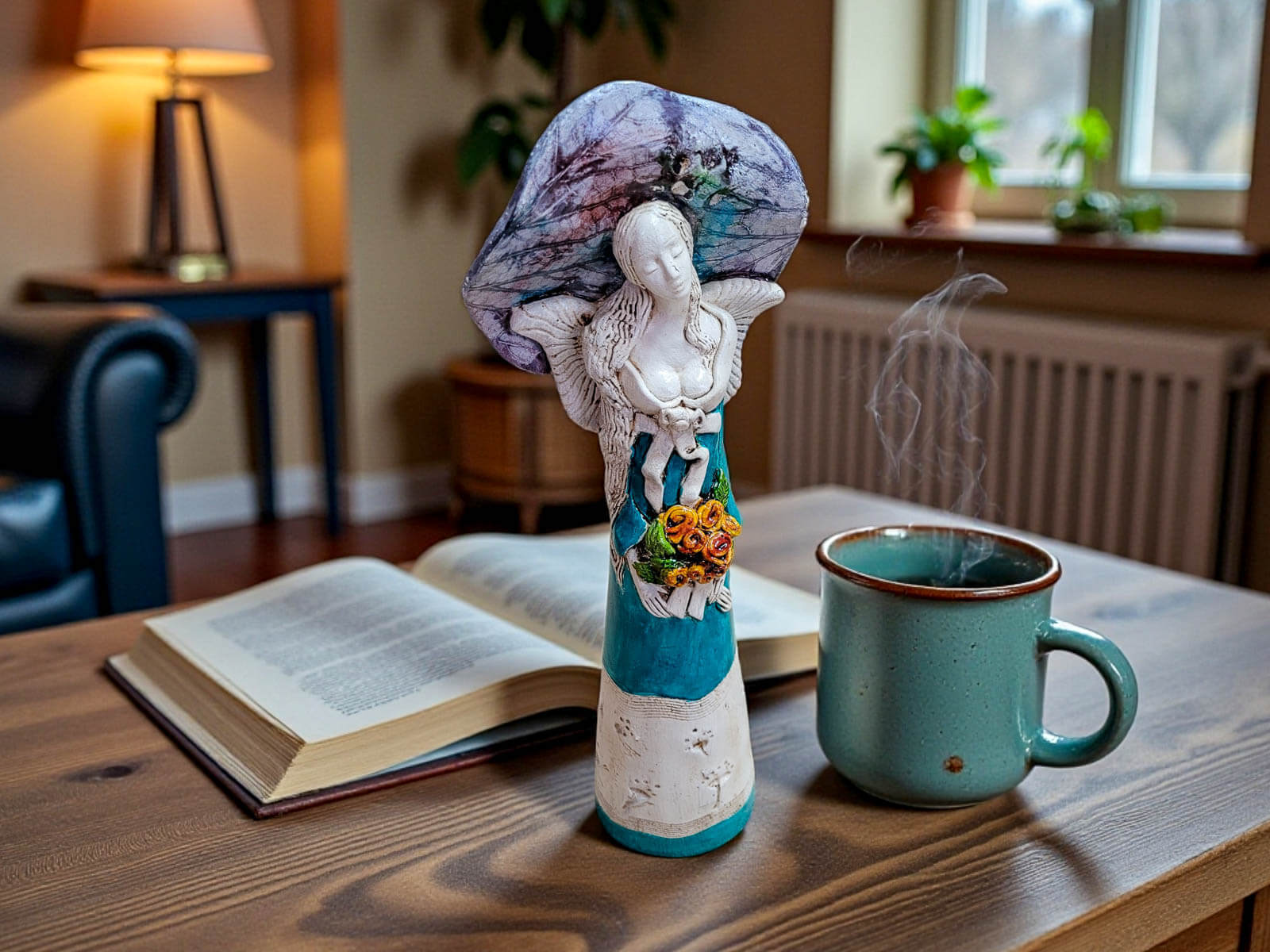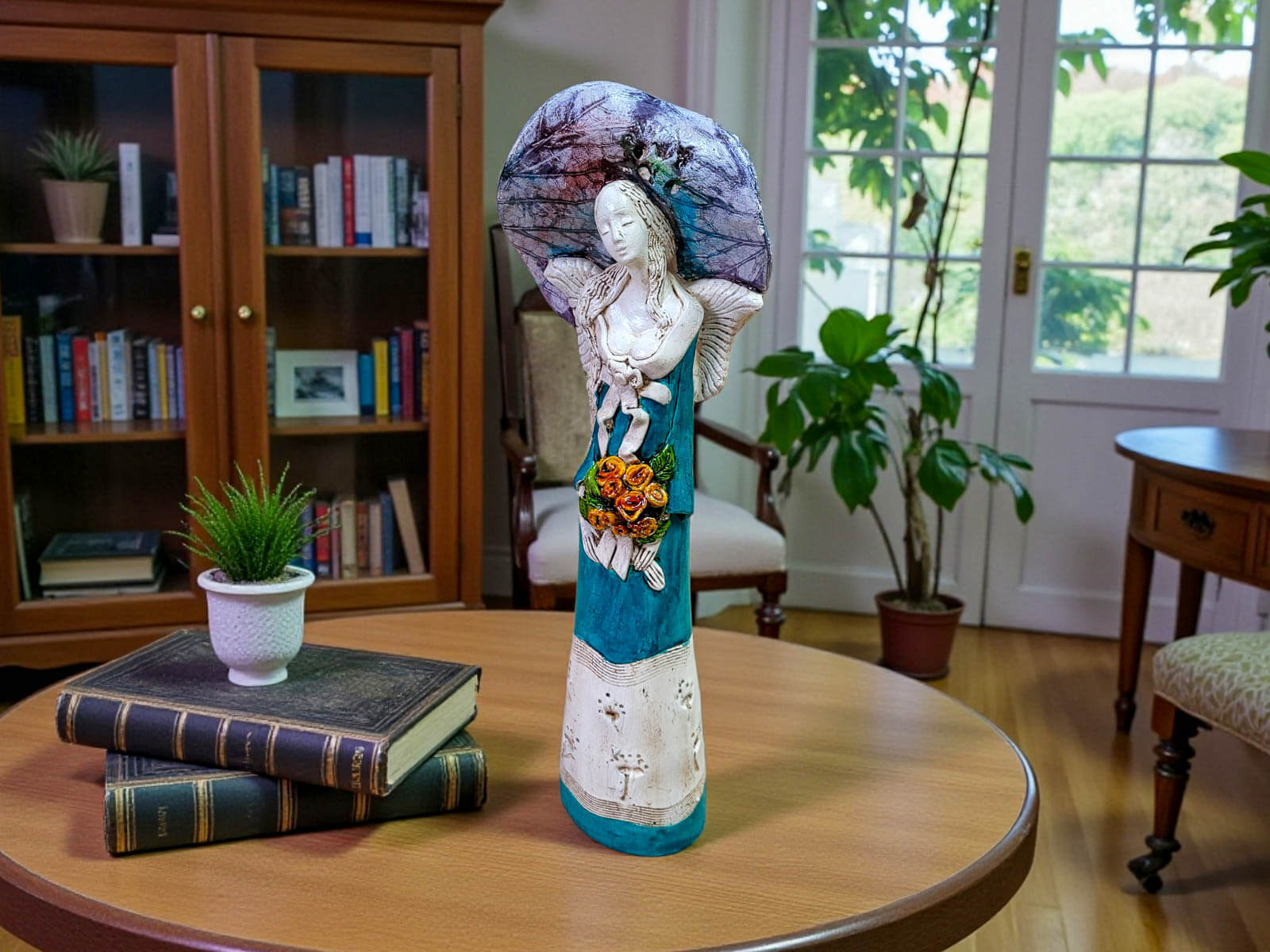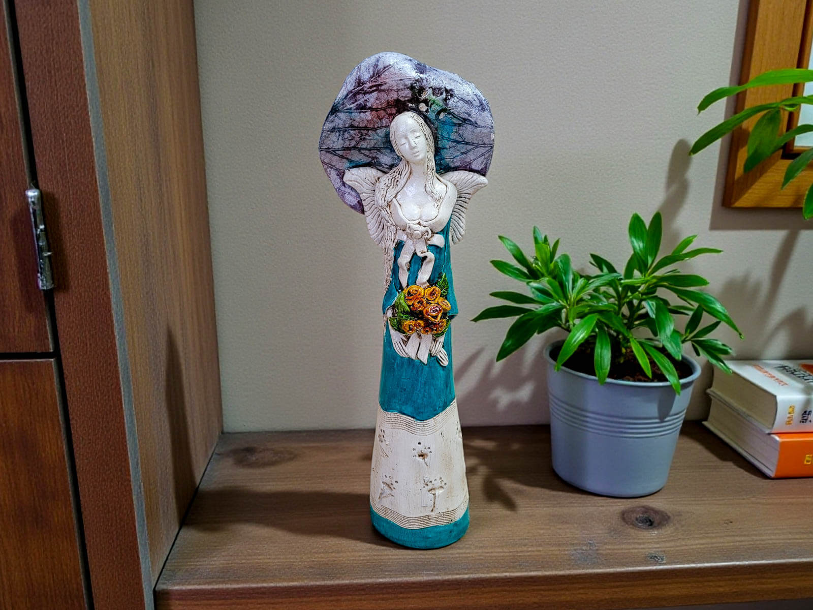To dekoracja, która nie ginie w tle. Doskonale sprawdzi się jako centralny element wystroju salonu, sypialni lub eleganckiego gabinetu, nadając wnętrzu wyjątkowy klimat i artystyczny charakter. Anioł Mabel podkreśla indywidualność przestrzeni i gust właściciela.