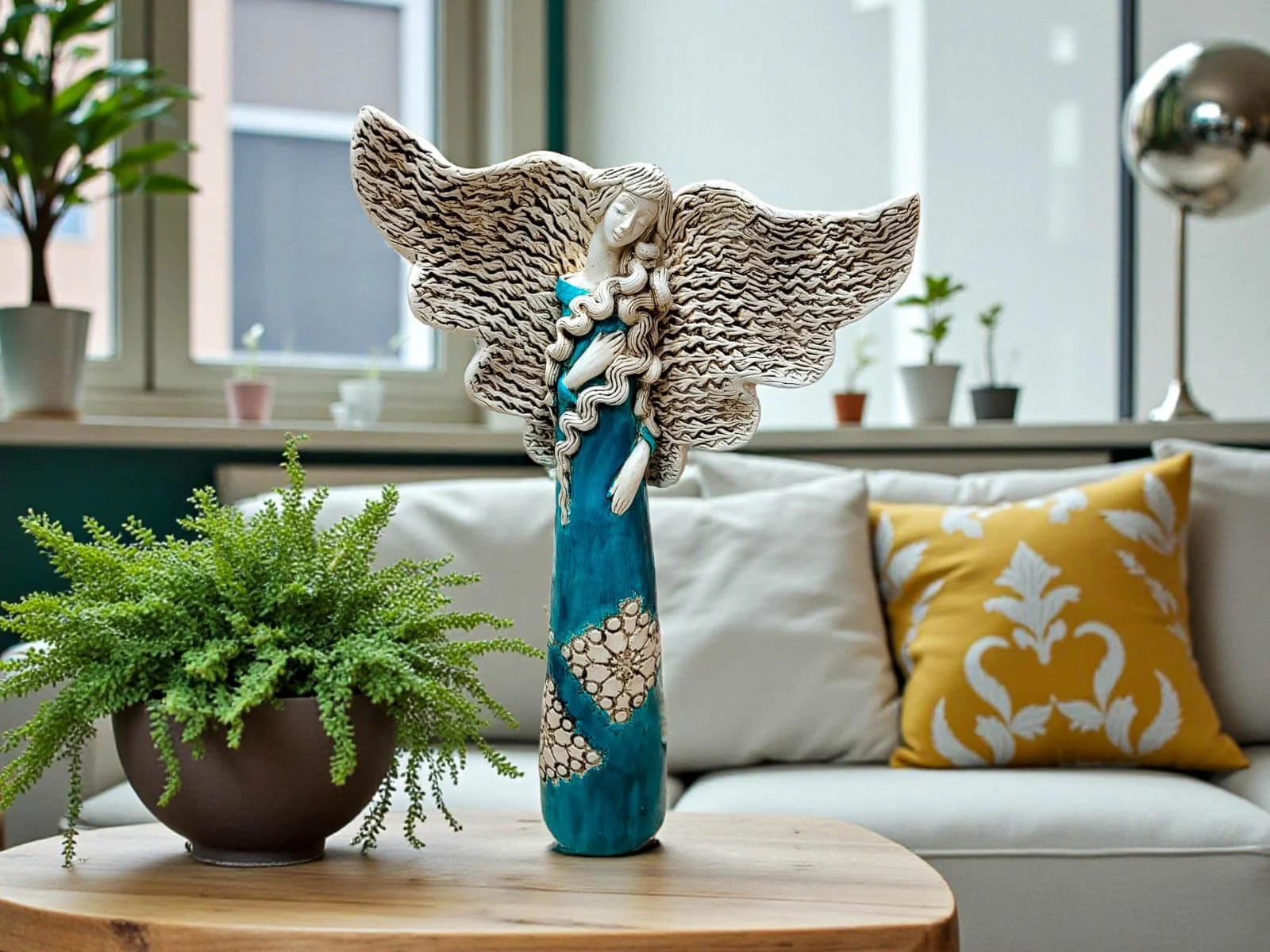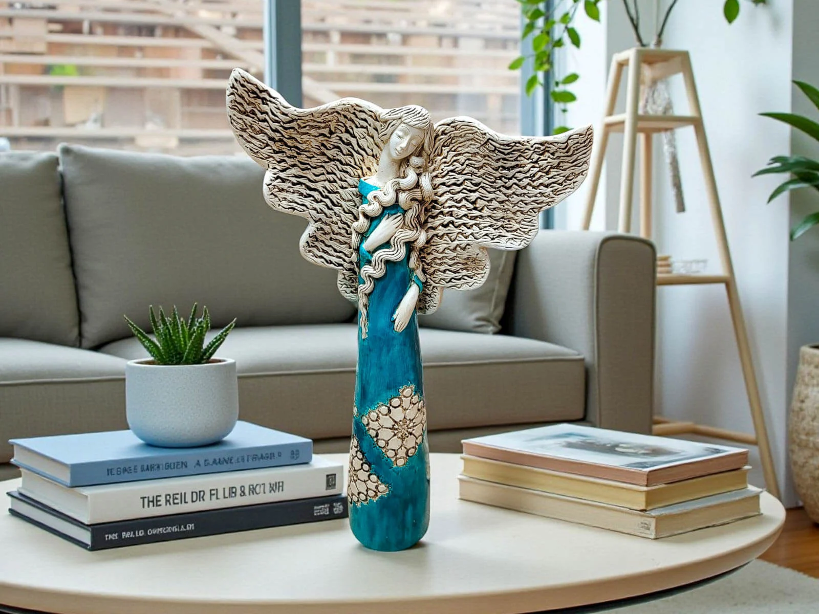 Turkus symbolizuje harmonię, nadzieję i odnowę, dlatego obecność tego anioła tworzy w przestrzeni przyjazną, kojącą atmosferę. Pięknie prezentuje się zarówno w salonie, sypialni, jak i w ogrodzie, stając się eleganckim akcentem dekoracyjnym, który przyciąga spojrzenia i wywołuje pozytywne emocje.