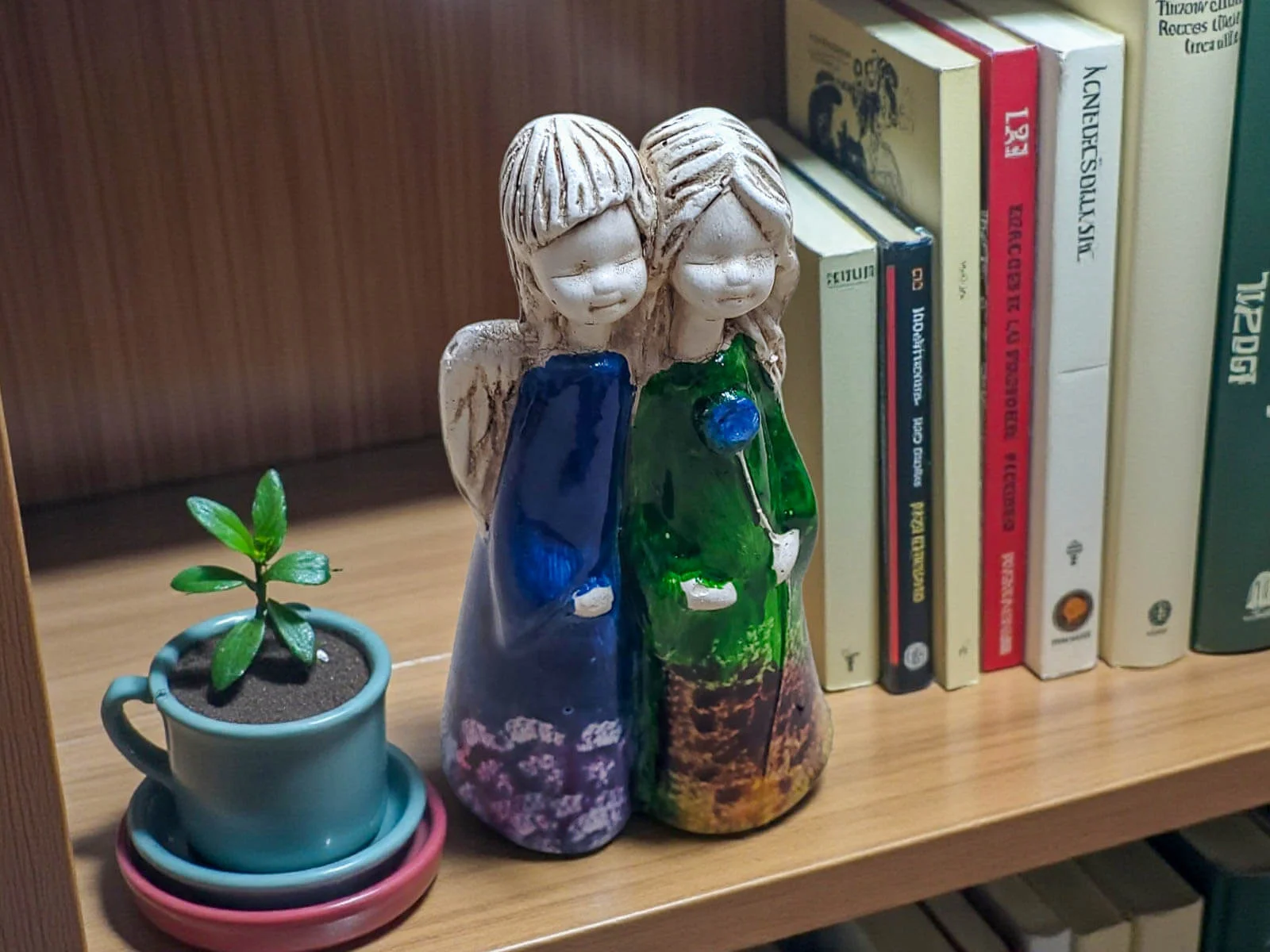 Apple & Ella w granatowo zielonej sukience to ręcznie wykonana figurka dwóch aniołków. Siostry czule się o siebie opierają. Może to świadczyć o ich siostrzanej bliskości oraz miłości do siebie. Aniołki ubrane są w piękne, długie subtelne suknie w kolorze białym i niebieskim, co świadczy o ich czystości, niewinności i beztroskim wieku dziecięcym. Figurka idealnie nadaje się na prezent dla dziewczynki jako pamiątka komunijna lub dla przyjaciółki. Pięknie będzie zdobić domowe wnętrze jak i spełniać funkcję ozdoby ogrodowej.