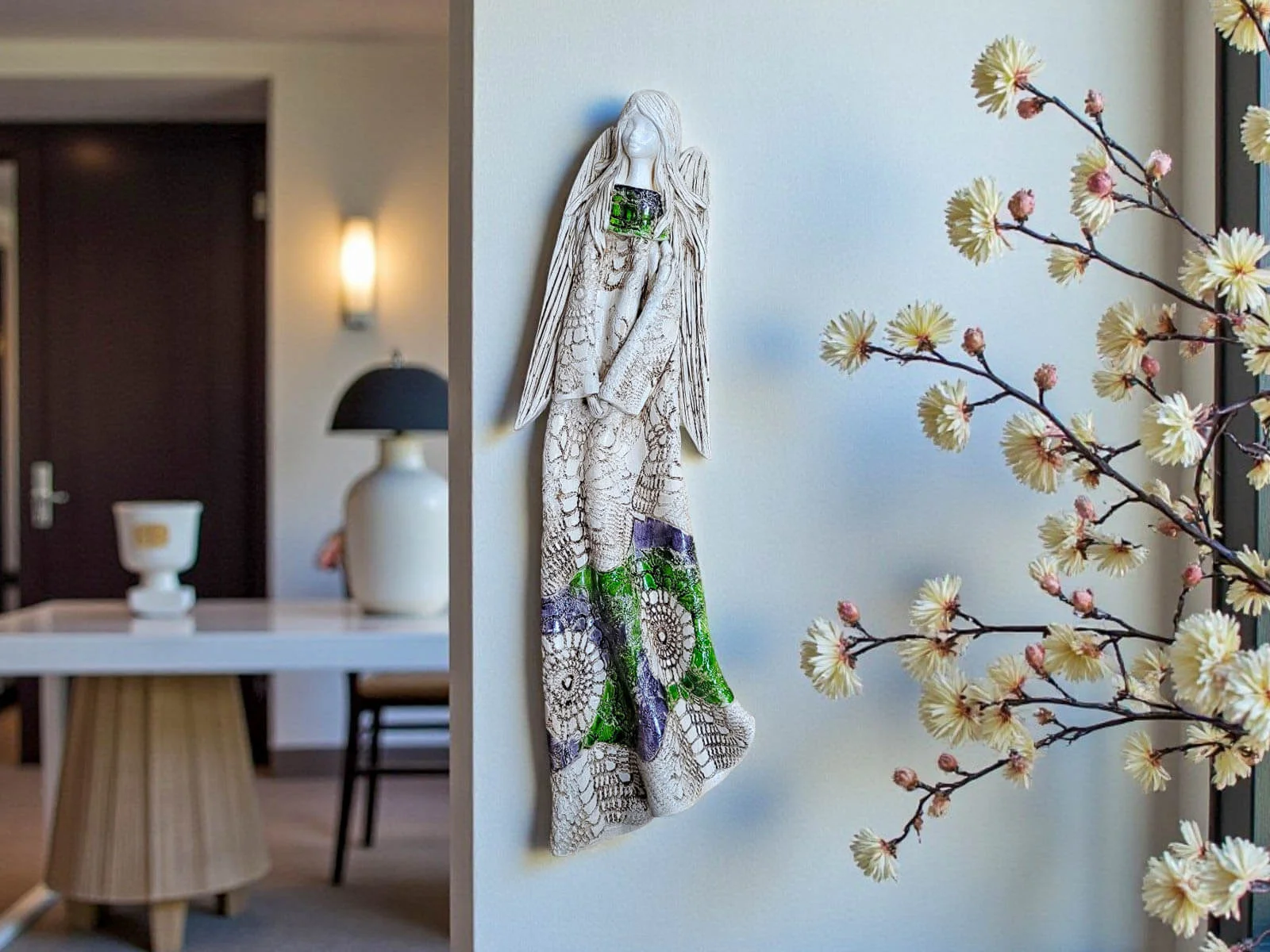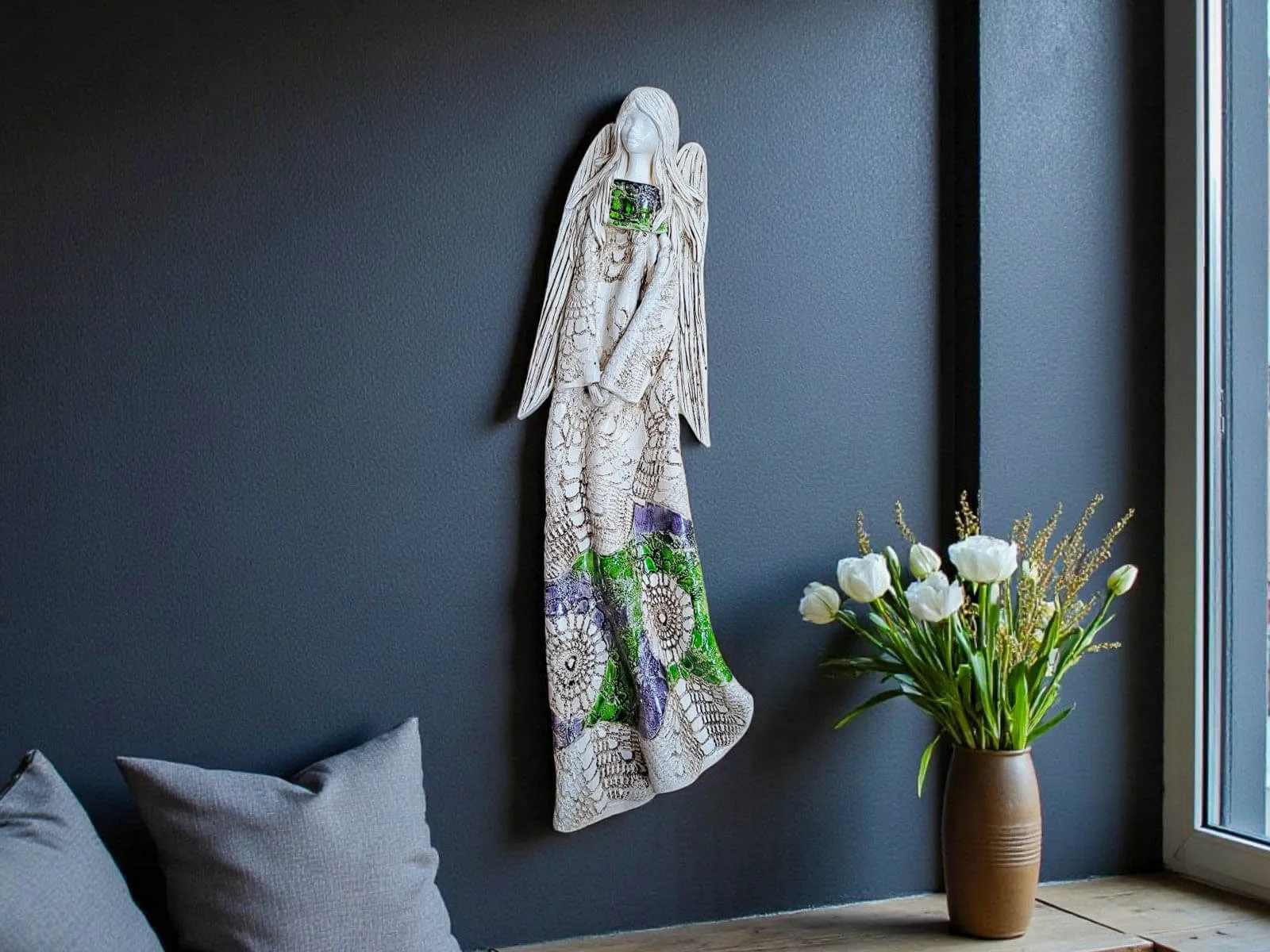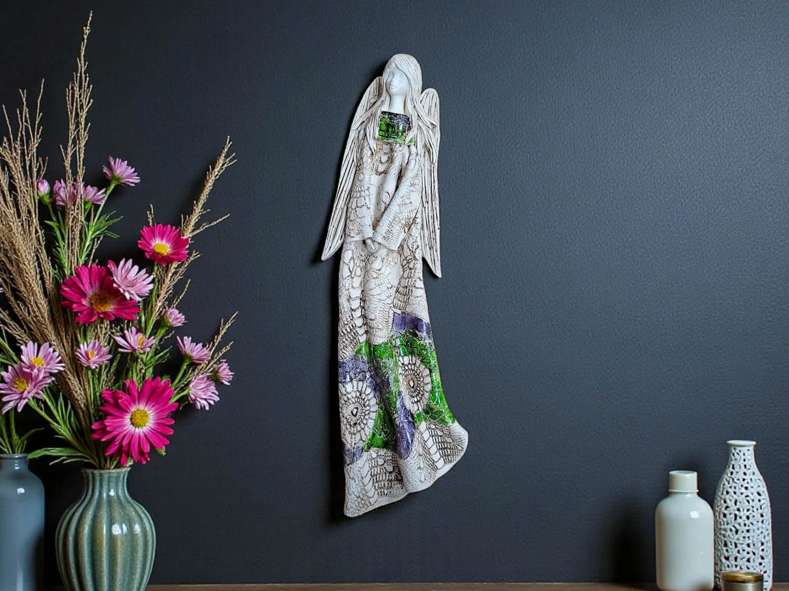Anioł Genesis to ręcznie wykonana figurka do zawieszenia na ścianę w odcieniach zieleni i szarości, która symbolizuje spokój, nadzieję i harmonię. To dekoracja, która nie tylko upiększa wnętrze, ale także niesie ze sobą głębokie przesłanie wsparcia, troski i życzliwości.