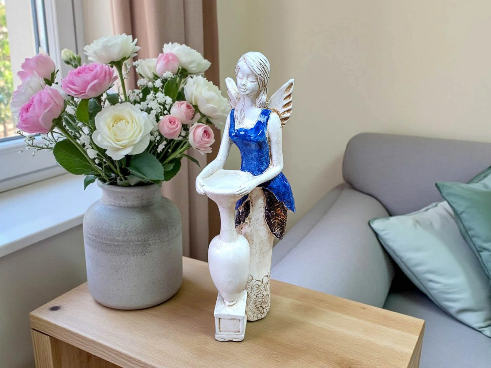 Niebieska suknia podkreśla harmonię i wyciszenie, a miękko opadające włosy dodają figurce subtelnej kobiecości. To dekoracja, która nie dominuje wnętrza, lecz buduje jego klimat – spokojny, przytulny i pełen dobrej energii.