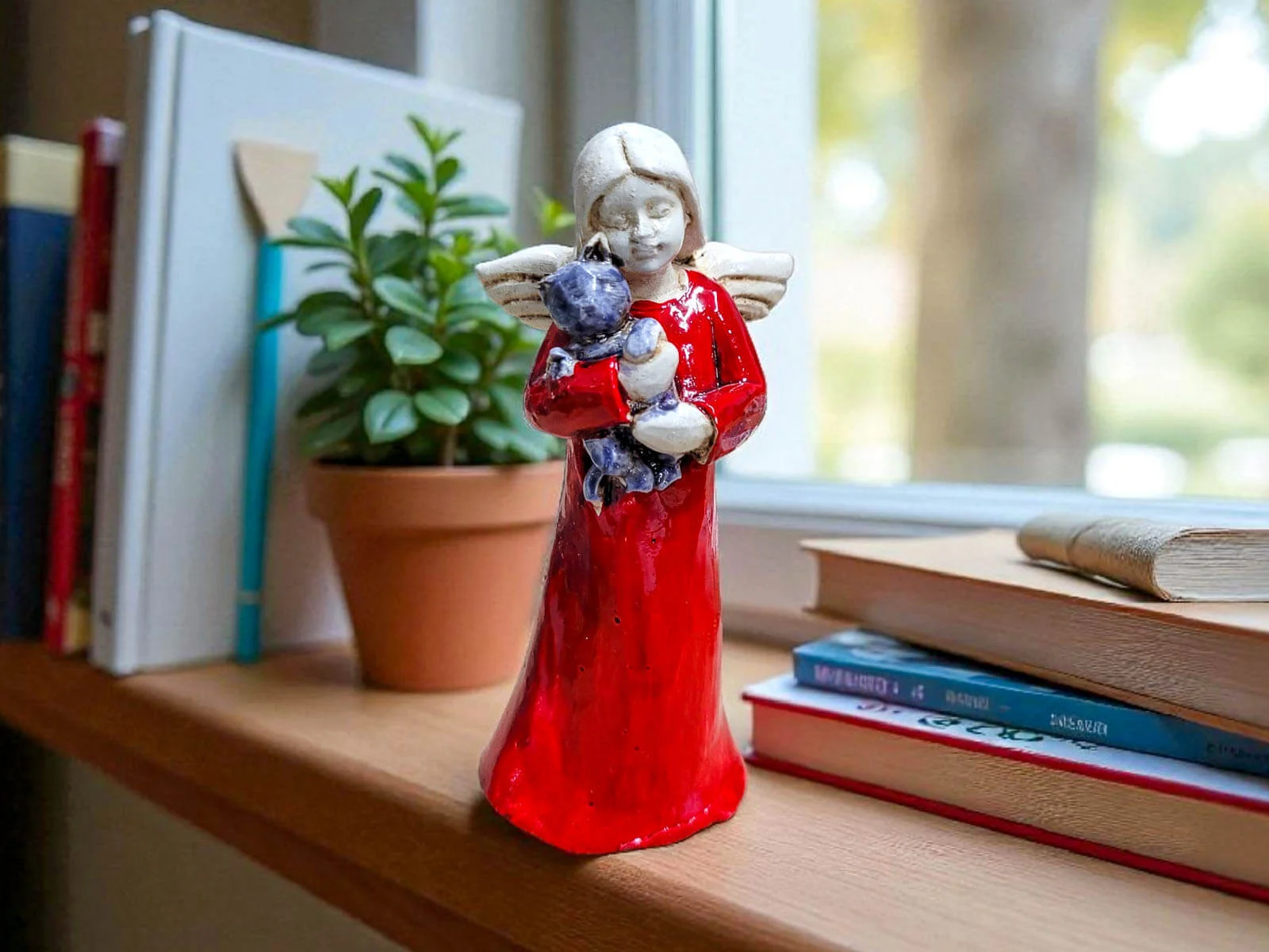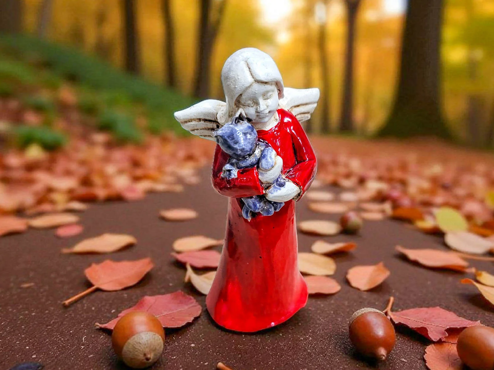 Urocza, ręcznie robiona figurka przedstawiająca małego aniołka – dziewczynkę trzymającą w ramionach kotka. Każdy egzemplarz wykonany jest ręcznie z dbałością o szczegóły, dzięki czemu każda figurka jest niepowtarzalna.