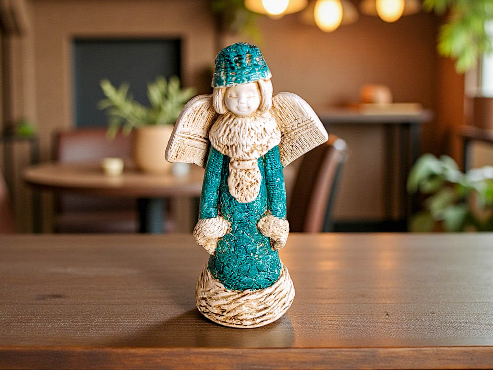 Aniołek Naya została utrzymana w harmonijnym połączeniu kolorów czerwonego, białego i turkusu, które nadają jej radosny, zimowy i bardzo świąteczny klimat. Delikatne detale, precyzyjne zdobienia i miękkie linie figurki sprawiają, że przyciąga wzrok od pierwszego spojrzenia.