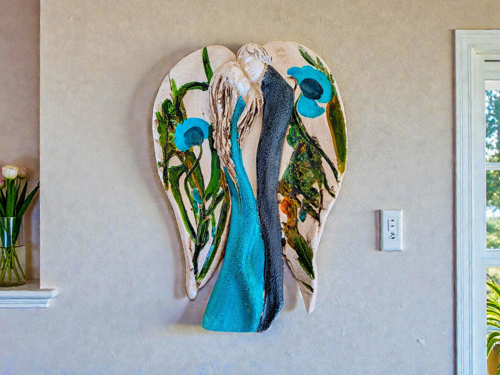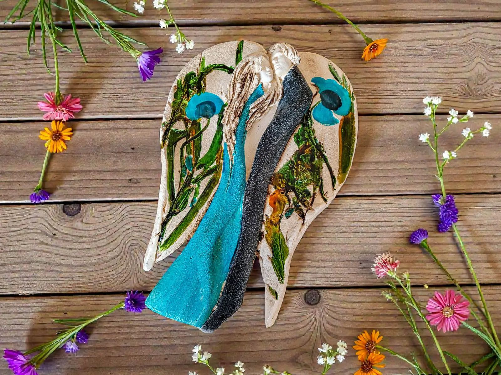 Kochające anioły w kolorach turkusu i ciemnego granatu. Anioły są ręcznie wykonane i ręcznie malowane. Anioły w objęciu tworzą jedność, są połączone miłością. Figurka idealnie nadaje się na prezent ślubny dla młodej pary, rocznicę ślubu i inne ważne wydarzenie. Anioły w rzeczywistości prezentują się dużo lepiej niż na zdjęciach, a obdarowane osoby z reguły są zachwycone z prezentu. Tutaj przeczytasz więcej o harmonii Yin Yang.