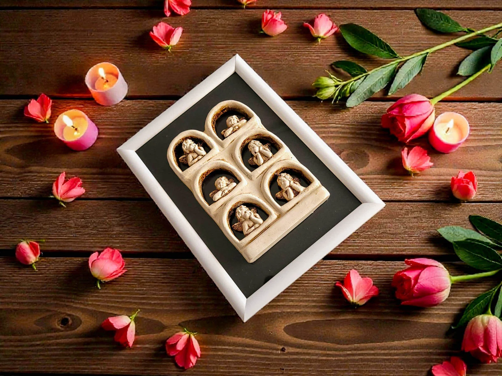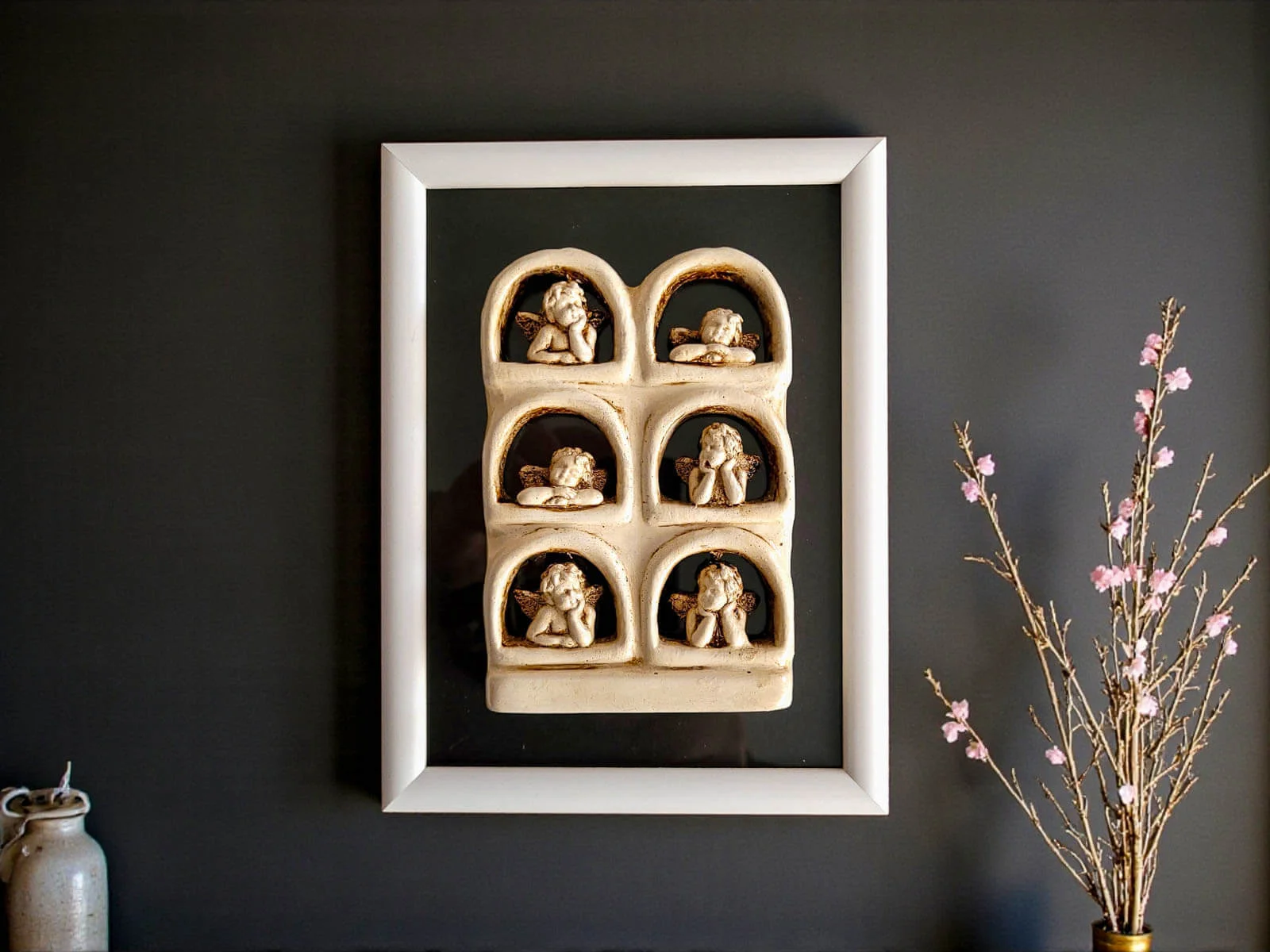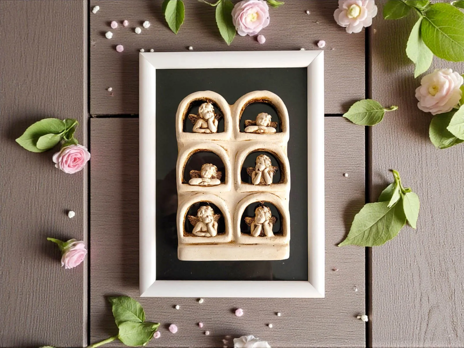 Aniołki w okienku to wyjątkowa dekoracja - sześć ręcznie robionych w Polsce aniołków, umieszczonych w eleganckiej, białej, drewnianej ramce. Każdy z nich zagląda przez swoje okienko w innej, pełnej uroku pozie – jedne spoglądają w dół, inne wychylają główki na bok, jeszcze inne wyciągają rączki. Razem tworzą słodką, harmonijną mozaikę, która przyciąga wzrok i wywołuje uśmiech za każdym spojrzeniem.