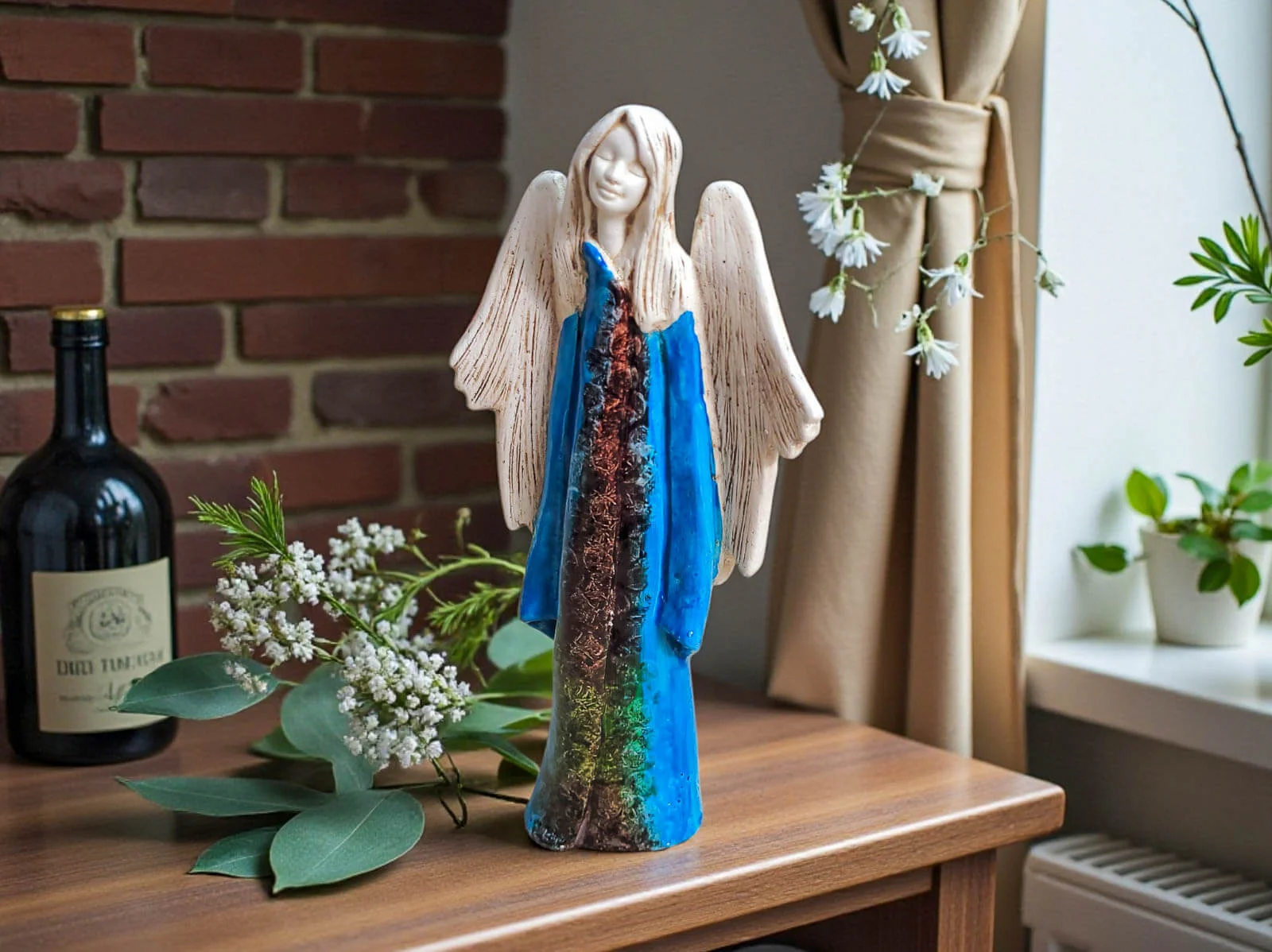Figurka Anioła Julia to ręcznie robiona figurka będąca artystyczną dekoracją, która podkreśli piękno każdego wnętrza. W fioletowej sukni ze zdobieniami figurka emanuje tajemniczym urokiem i delikatnością.