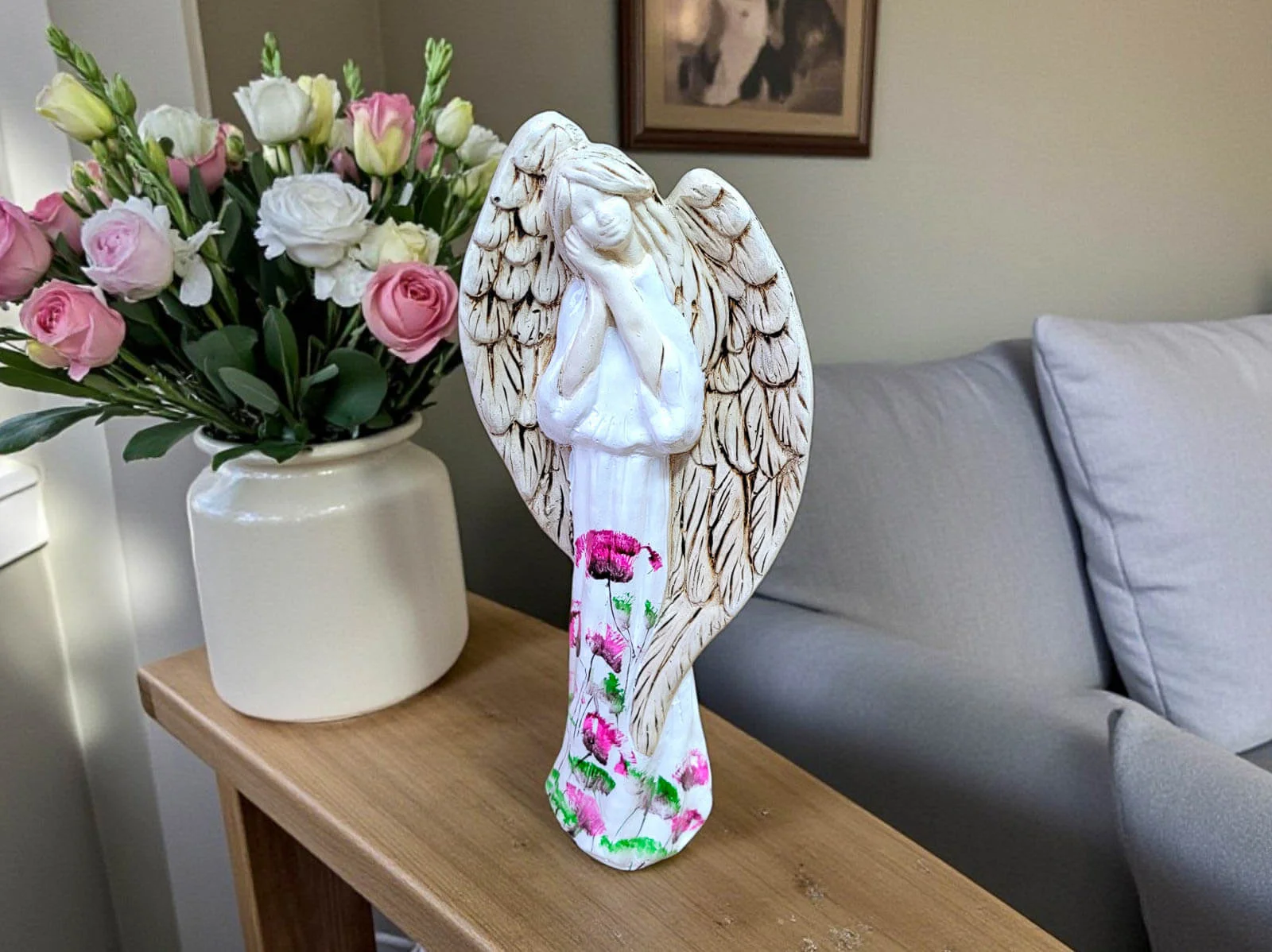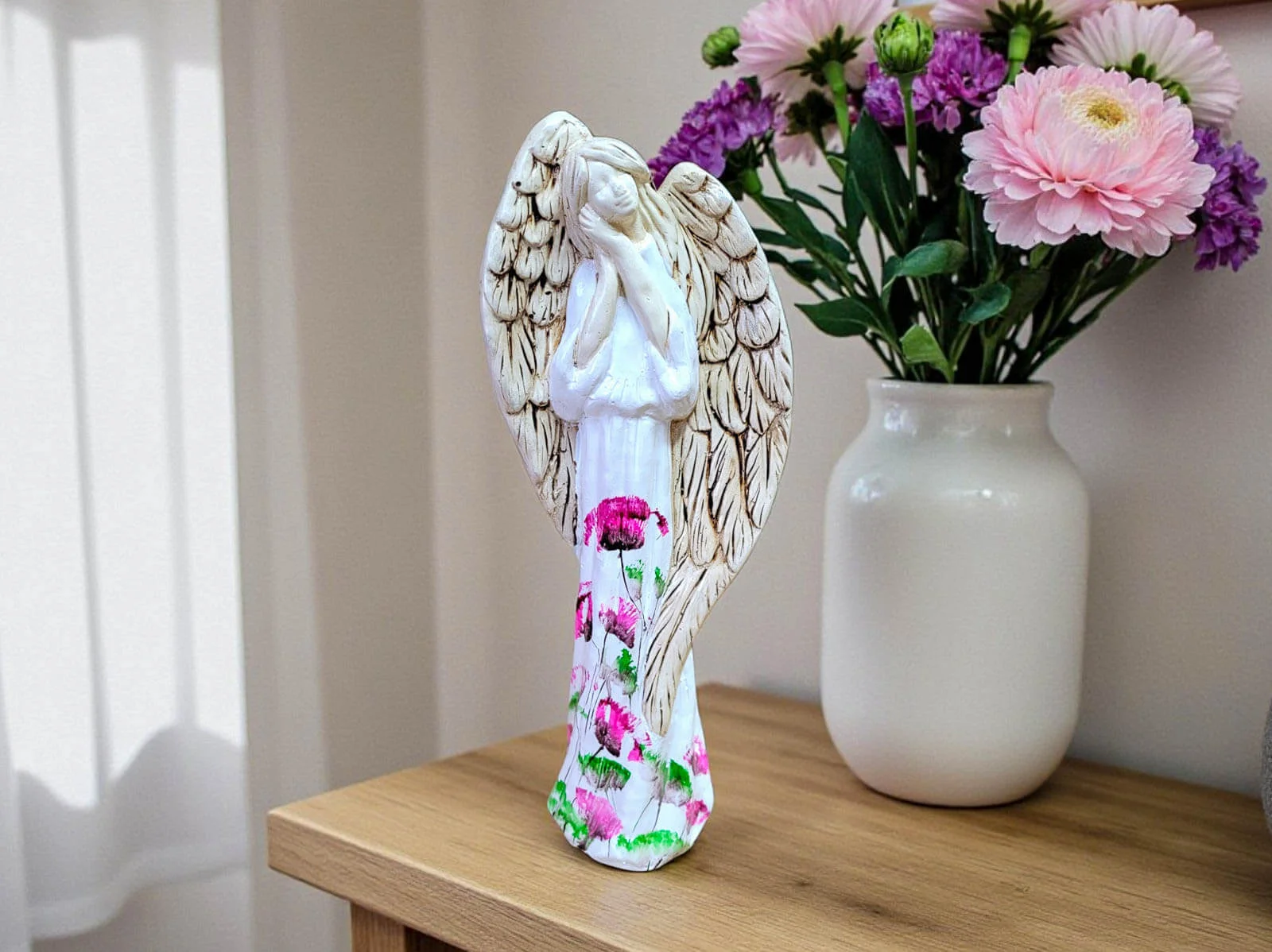 Anioł Gabriel w unikatowej wersji z kwiatami (kolekcja Flower Art) to ręcznie wykonana gipsowa figurka w pięknych odcieniach bieli i beżu. Anioł ma cudowne, rozłożyste skrzydła i przybiera postać o złożonych dłoniach przy twarzy, na której maluje się spokój i melancholia. Idealnie sprawdzi się na prezent ślubny czy komunijny.