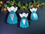 Komplet trzech turkusowych aniołków, wykonanych i malowanych ręcznie w Polsce. Każdy aniołek ma inne rozmiary, dzięki czemu razem tworzą harmonijny zestaw, idealny do powieszenia na choince, ścianie lub w oknie.