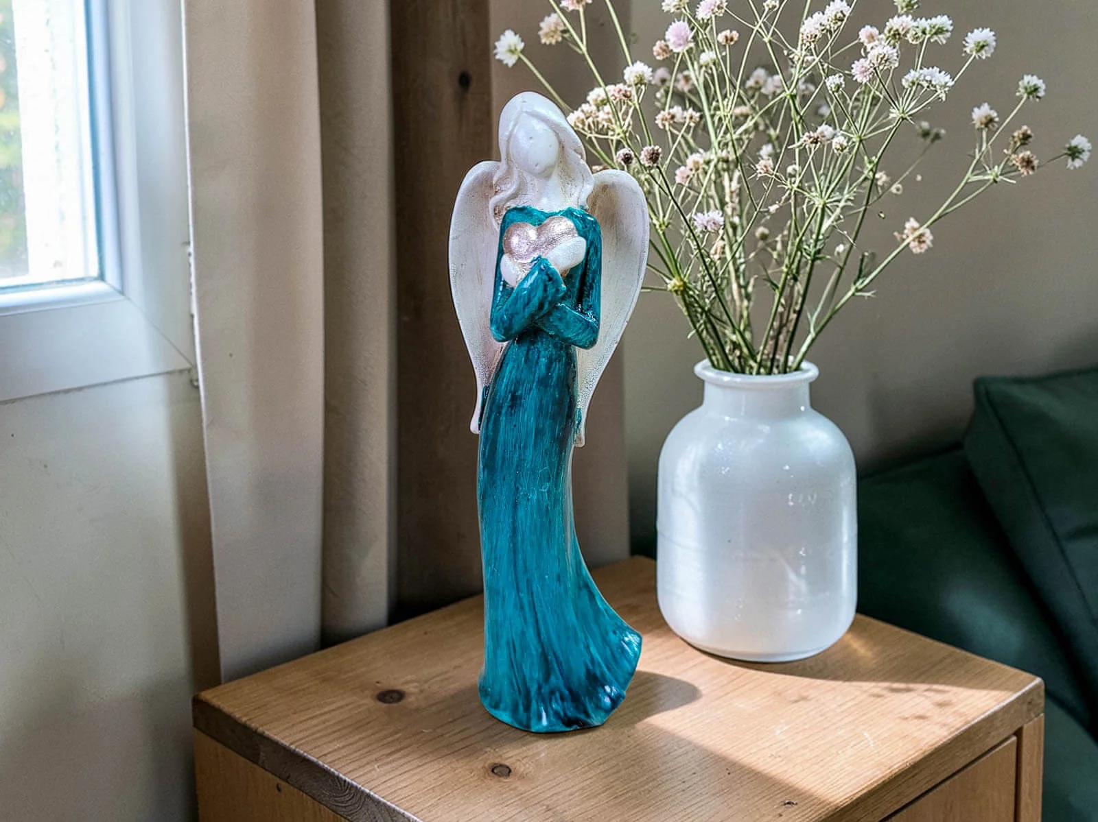 Ayla to aniołek Światła i Serca w turkusowej sukni. Jest to subtelny, ręcznie wykonany aniołek, który mówi więcej ciszą niż słowami. Jej imię oznacza światło księżyca – i dokładnie taką energię wnosi do przestrzeni: łagodną, kojącą i pełną ciepła. Bez twarzy, stojąca w skupieniu, z dłońmi złożonymi na piersi i trzymanym w nich złote złotym sercem, Ayla staje się uniwersalnym symbolem miłości, intencji i obecności.