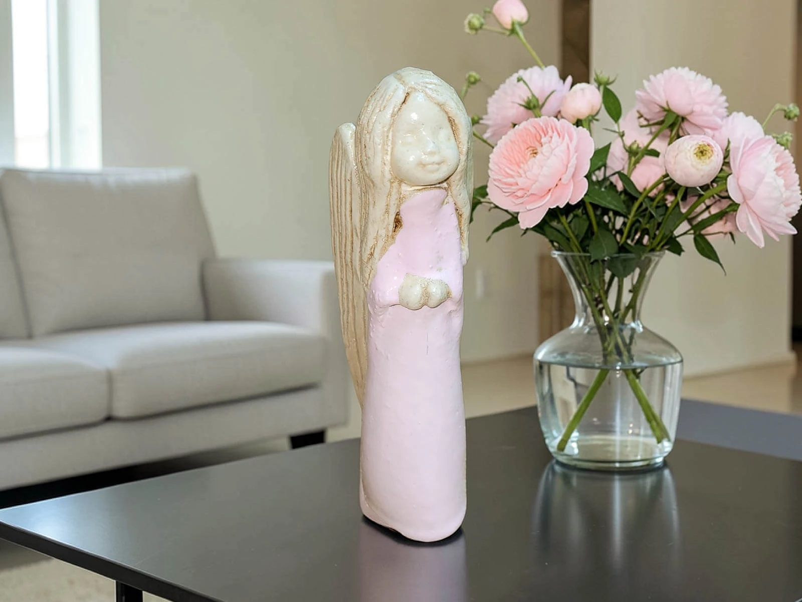 Jeśli anioł ma zostać wręczony jako prezent możemy go również elegancko zapakować w przeźroczysty celofan wiązany ekologicznym sznurkiem. Dzięki temu anioł będzie wyglądał jeszcze bardziej dostojnie i będzie gotowy do wręczenia. Dla wygody możesz również od razu zakupić papierową białą torbę prezentową.