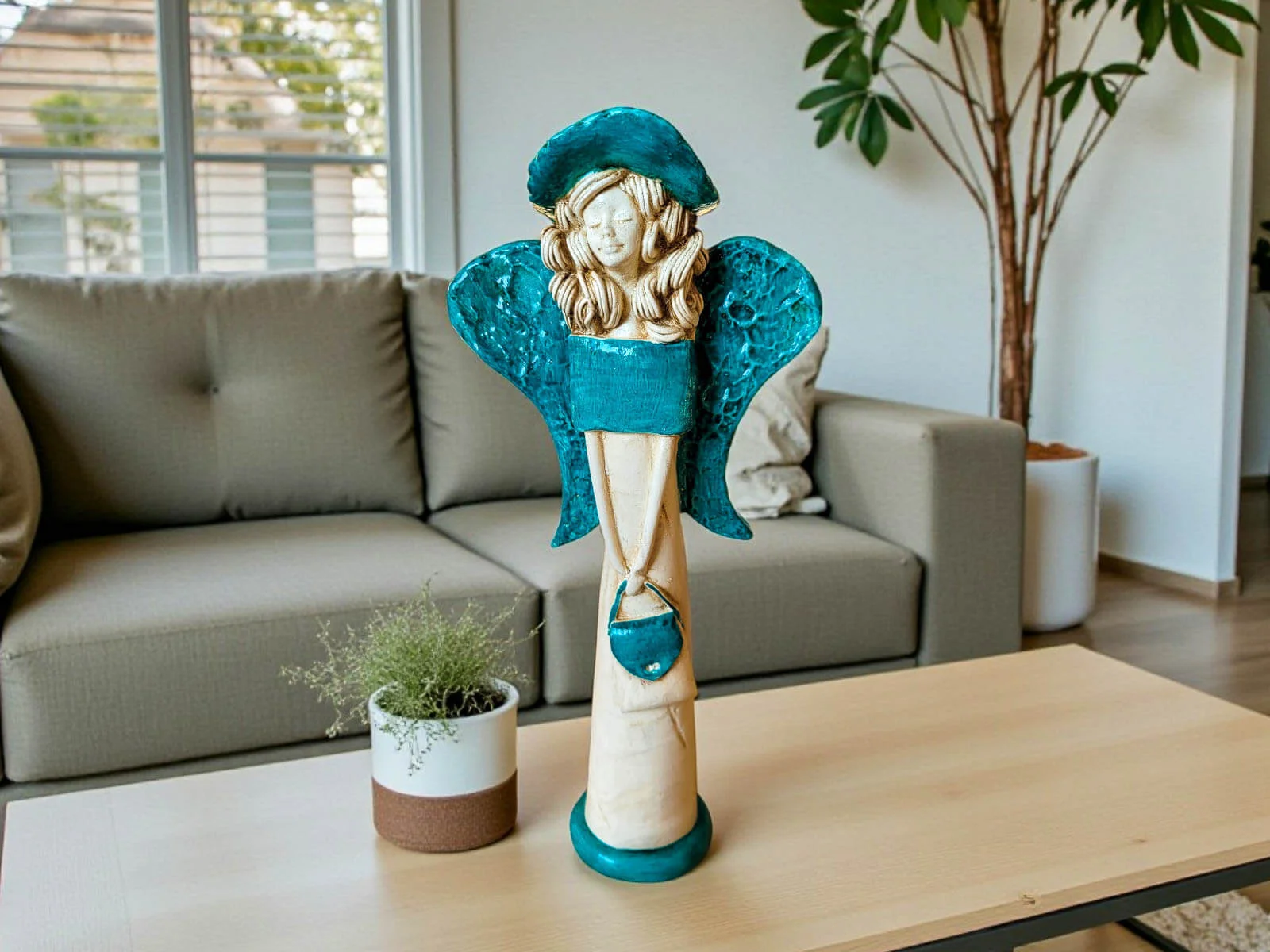 Anioł Coco w kolorze turkusowym to ręcznie wykonana figurka o filigranowej, dziewczęcej formie, która wnosi do przestrzeni spokój, poczucie opieki i czystości intencji. Turkusowa kolorystyka działa kojąco, symbolizując harmonię, bezpieczeństwo i dobre emocje — idealne wartości na początek nowej, ważnej drogi.