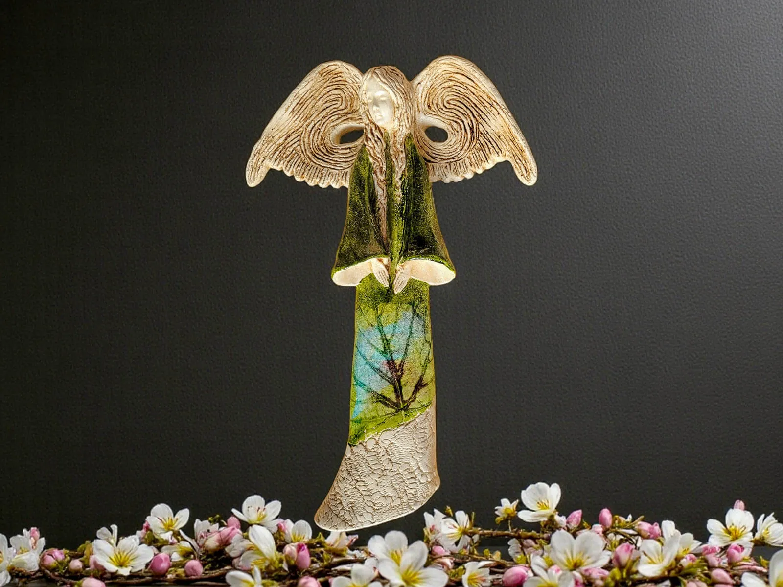 Jej zielona suknia zdobiona prawdziwymi liśćmi zachwyca naturalnością i elegancją, a rozłożyste, imponujące skrzydła nadają figurze lekkość i wznoszącą energię. Clara to doskonały akcent dekoracyjny do salonu, sypialni, korytarza czy gabinetu, wprowadzający do wnętrza spokój, harmonię i piękno natury.