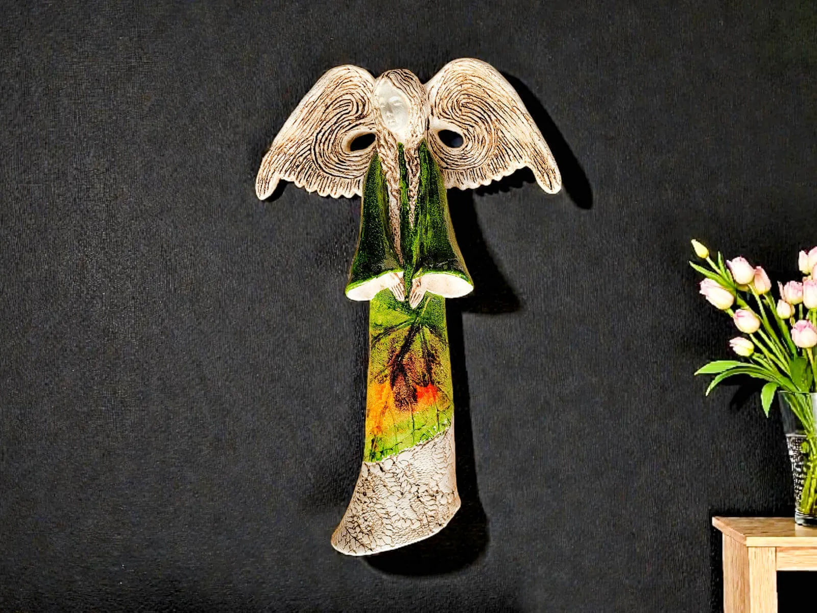 Jej zielona suknia zdobiona prawdziwymi liśćmi zachwyca naturalnością i elegancją, a rozłożyste, imponujące skrzydła nadają figurze lekkość i wznoszącą energię. Clara to doskonały akcent dekoracyjny do salonu, sypialni, korytarza czy gabinetu, wprowadzający do wnętrza spokój, harmonię i piękno natury.