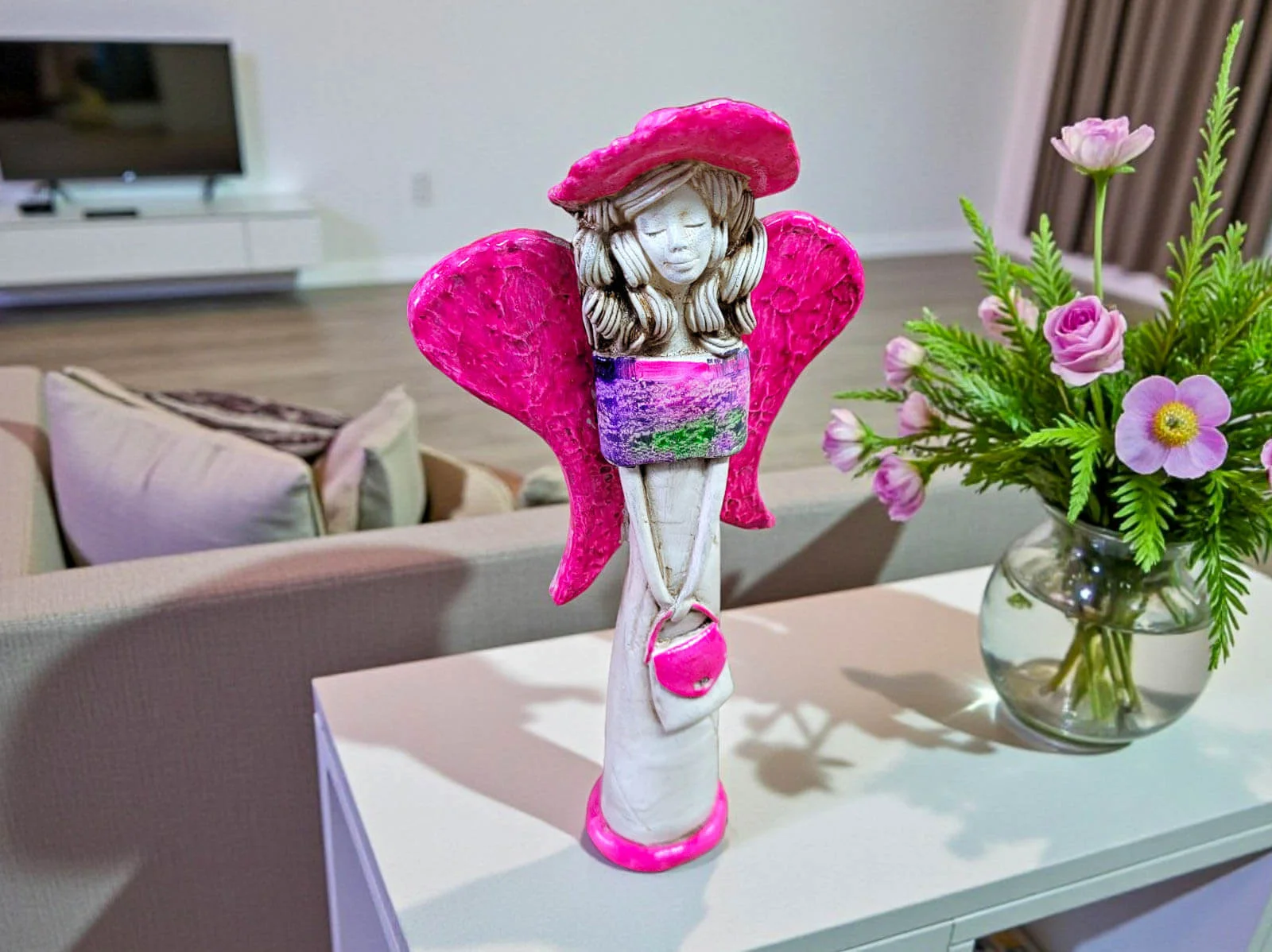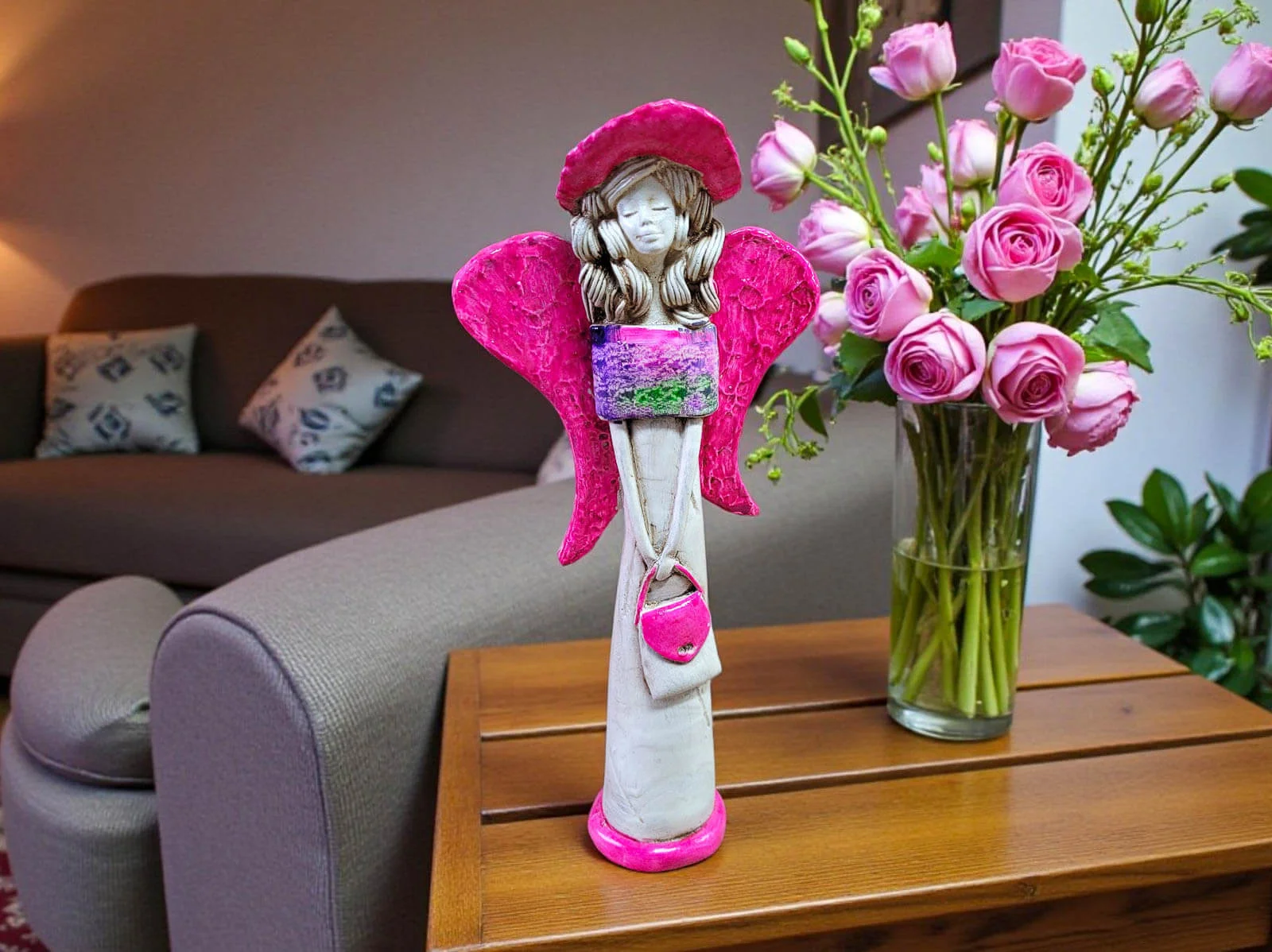 Ręczne wykonanie sprawia, że każda sztuka ma swój unikalny charakter – wybierasz nie masowy produkt, lecz dekorację z duszą. Połączenie beżowej bazy z różową suknią i kolorowymi wzorami dodaje figurce świeżości i kobiecego uroku, dzięki czemu pięknie prezentuje się zarówno w pokoju dziewczynki, jak i w eleganckim salonie czy sypialni.