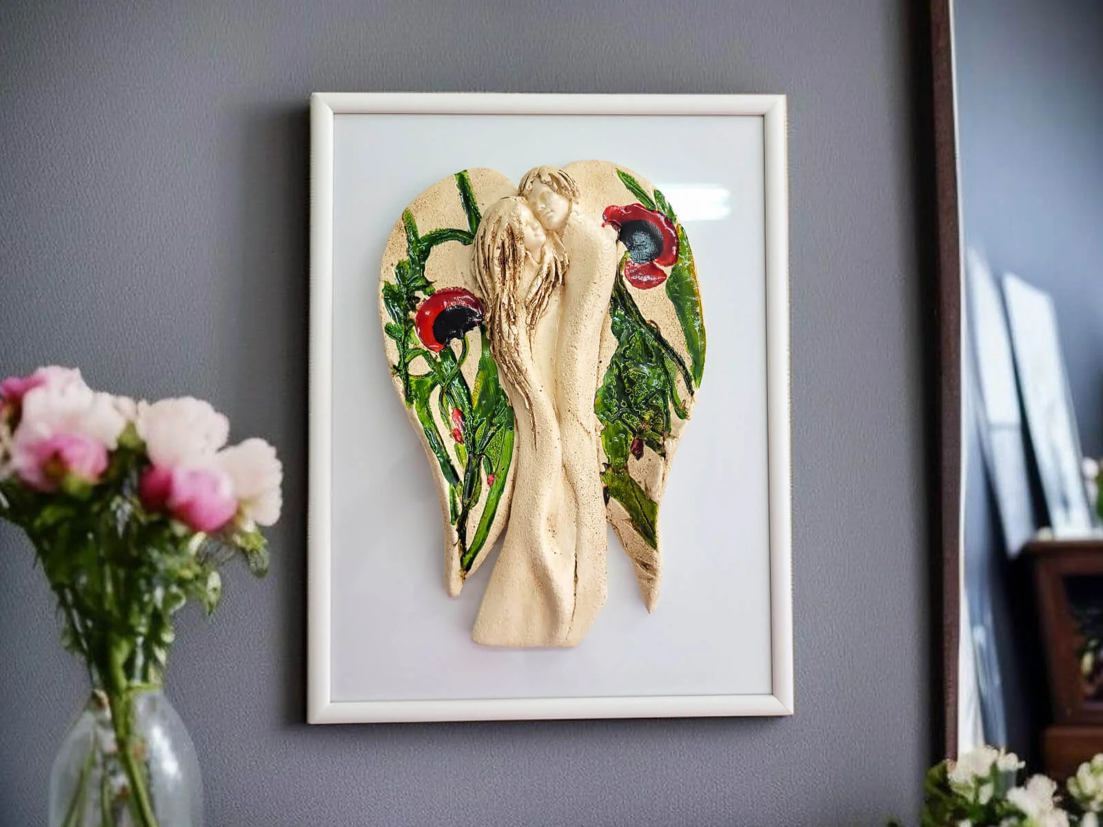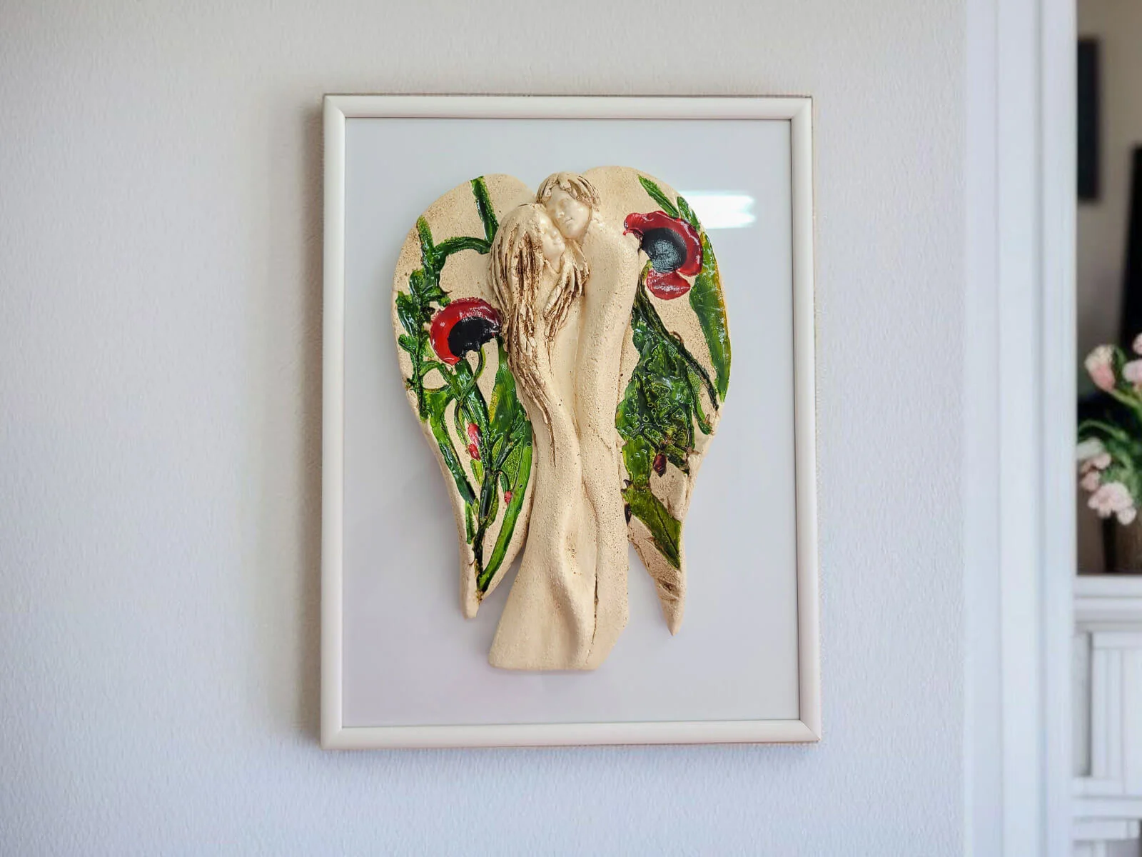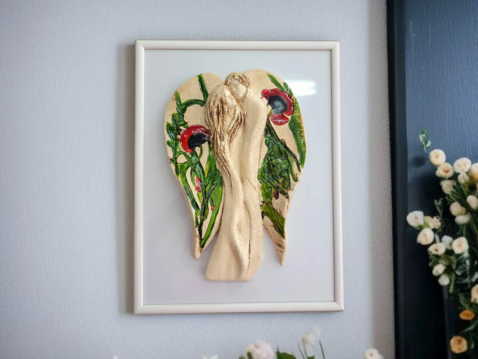 Ręcznie robione i malowane figurka Kochających Aniołów w wersji beżowej z kolorowymi makami w komplecie z elegancką ramką. Idealne na prezent na ślub lub rocznicę ślubu. Anioły symbolizują wielką miłość, splecione w miłosnym uścisku. Figurka nawiązuje do symbolu energetycznej harmonii - Yin Yang. Idealna na prezent na ślub lub rocznicę ślubu, dla kochającej pary. Pięknie prezentuje się na ścianie w salonie czy sypialni. Klienci twierdzą, że w rzeczywistości wygląda lepiej niż na zdjęciach. Tutaj przeczytasz więcej o harmonii Yin Yang.