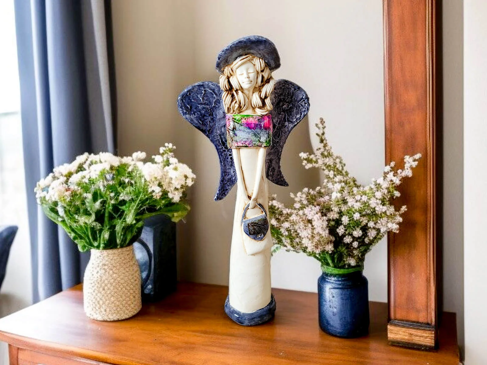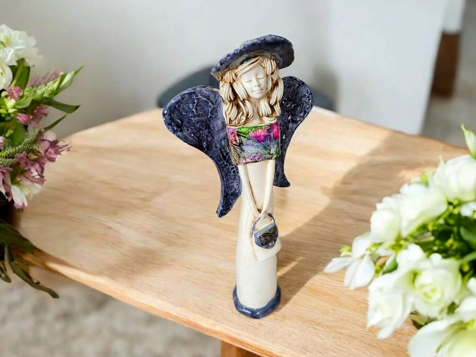 Anioł Coco w unikalnej kolekcji Art Leaf. Coco to ręcznie wykonana figurka gipsowa w kształcie filigranowej dziewczynki. Ma cudowne rozłożyste skrzydła. Jej beżowy ubiór podkreślają kolorowe akcenty z wzorami liści. Figurka Coco idealnie nadaje się na prezent na dziewczynki lub kobiety jak piękna ozdoba wnosząca do wnętrza dużo pozytywnej energii.