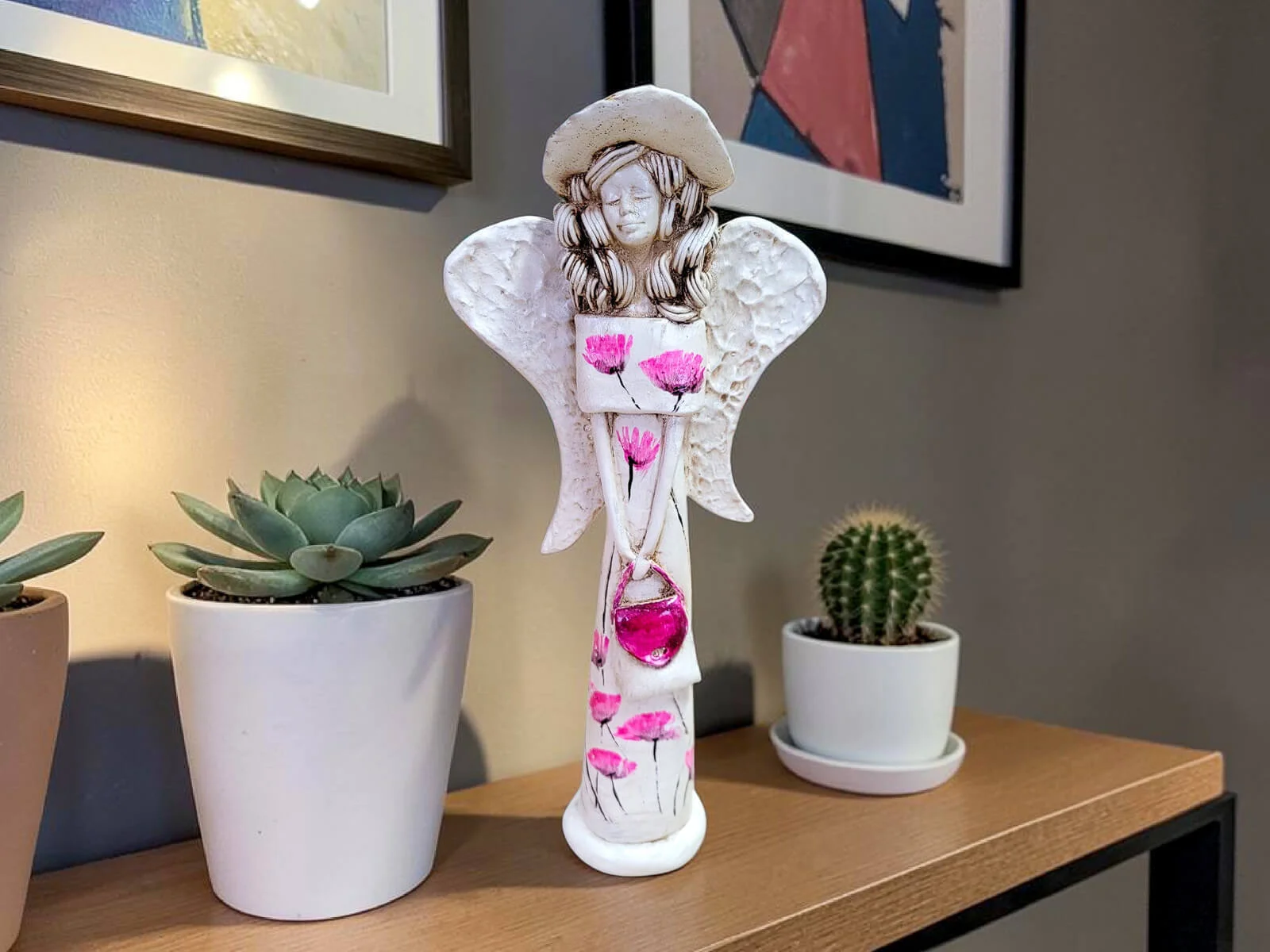 Anioł Coco w unikalnej kolekcji Art Flower z malowanymi kwiatami. Coco to ręcznie wykonana figurka gipsowa w kształcie filigranowej dziewczynki. Ma cudowne rozłożyste skrzydła. Jej beżowy ubiór podkreślają kolorowe kwiaty. Figurka Coco idealnie nadaje się na prezent na dziewczynki lub kobiety jak piękna ozdoba wnosząca do wnętrza dużo pozytywnej energii.