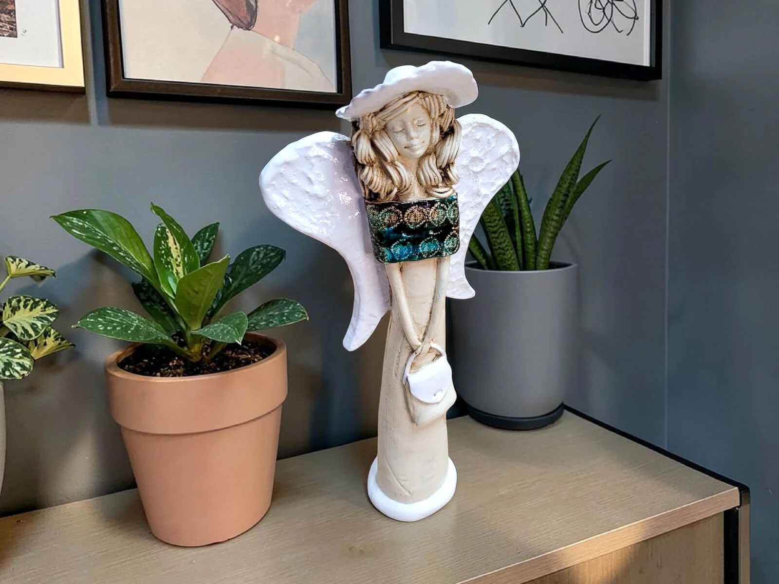 Anioł Coco w unikalnej kolekcji Art. Coco to ręcznie wykonana figurka gipsowa w kształcie filigranowej dziewczynki. Ma cudowne rozłożyste skrzydła. Jej beżowy ubiór podkreślają kolorowe akcenty. Figurka Coco idealnie nadaje się na prezent na dziewczynki lub kobiety jak piękna ozdoba wnosząca do wnętrza dużo pozytywnej energii.