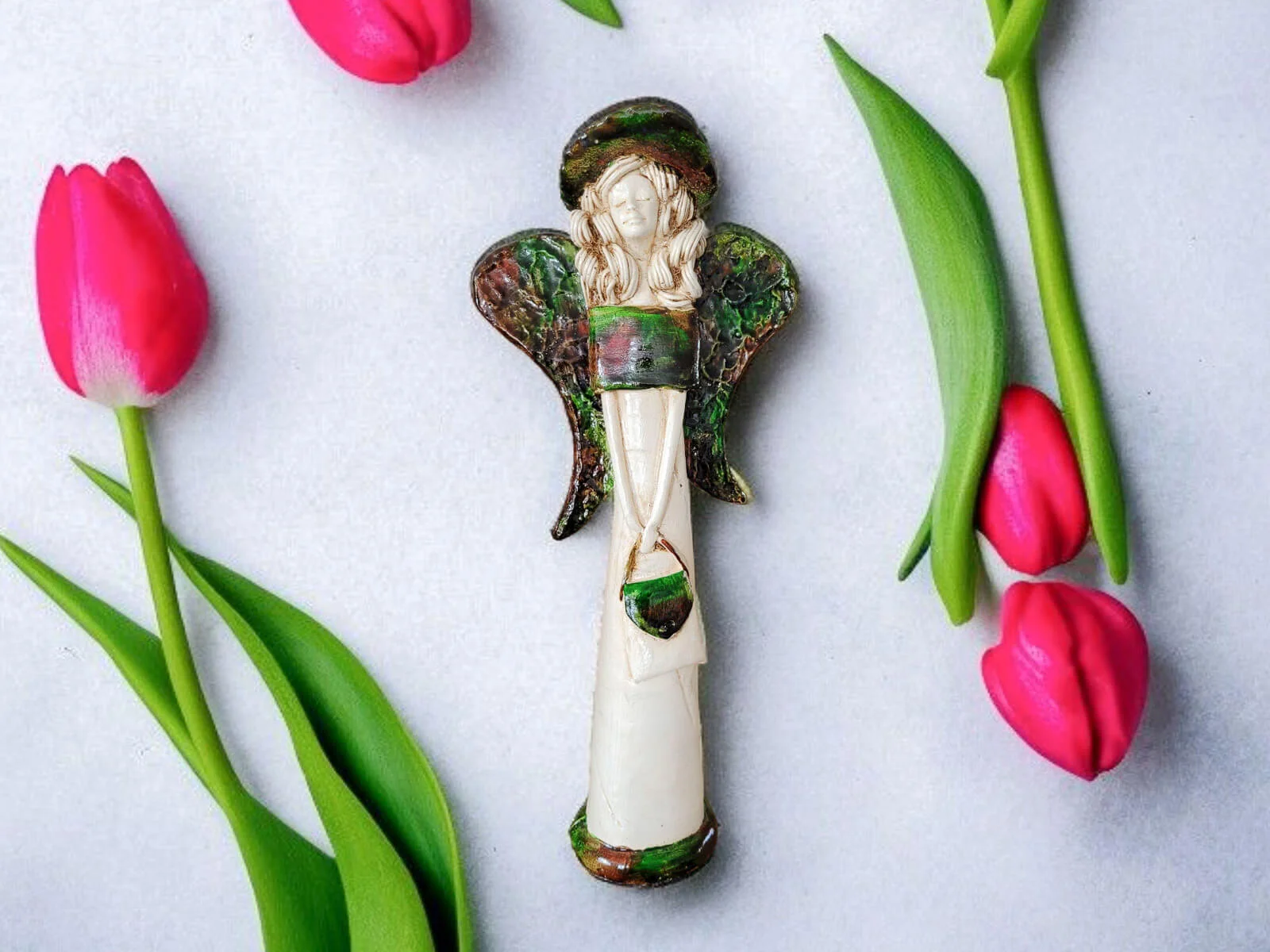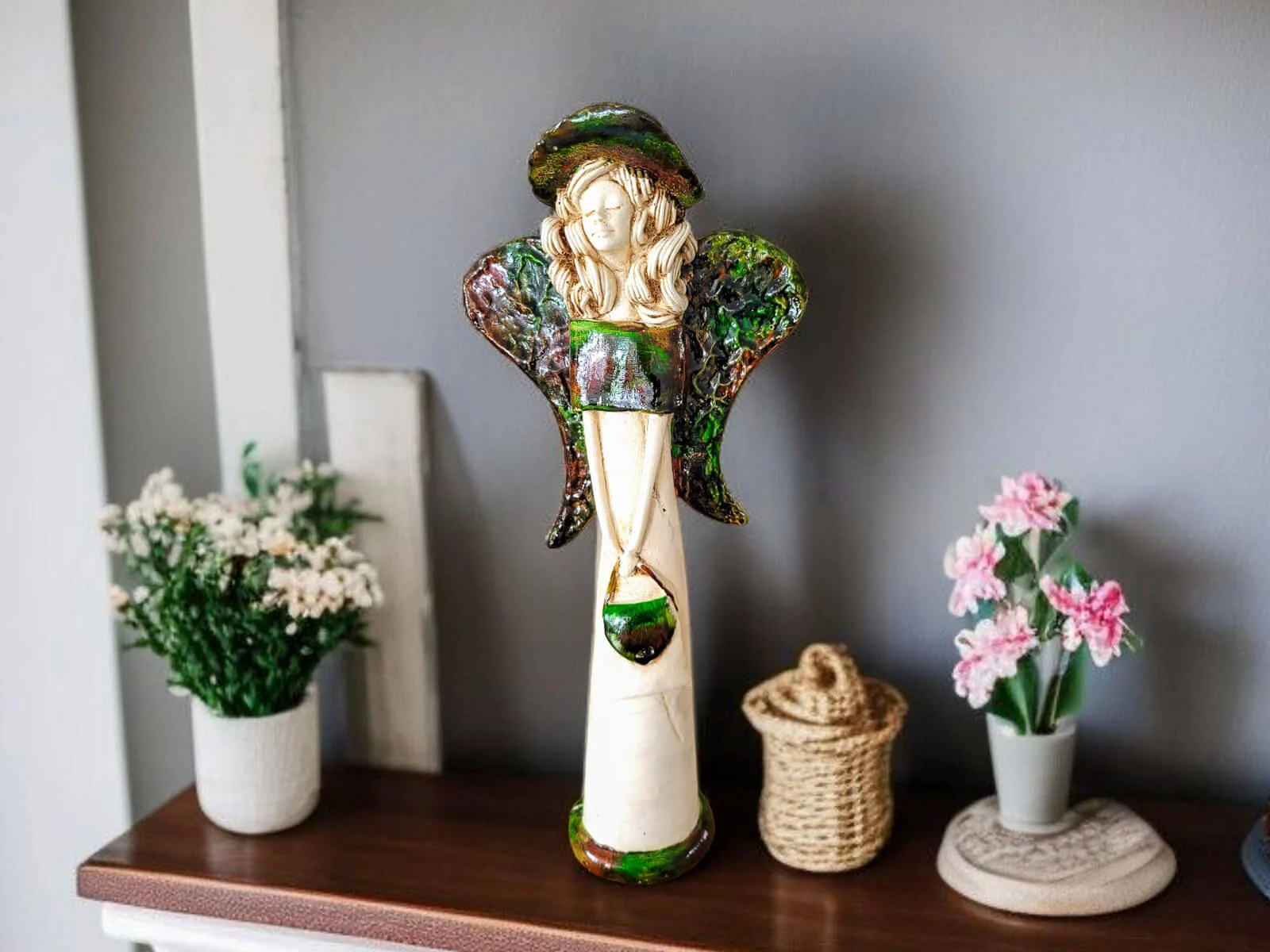 Jeśli anioł ma zostać wręczony jako prezent możemy go również elegancko zapakować w przeźroczysty celofan wiązany ekologicznym sznurkiem. Dzięki temu anioł będzie wyglądał jeszcze bardziej dostojnie i będzie gotowy do wręczenia. Dla wygody możesz również od razu zakupić papierową białą torbę prezentową.