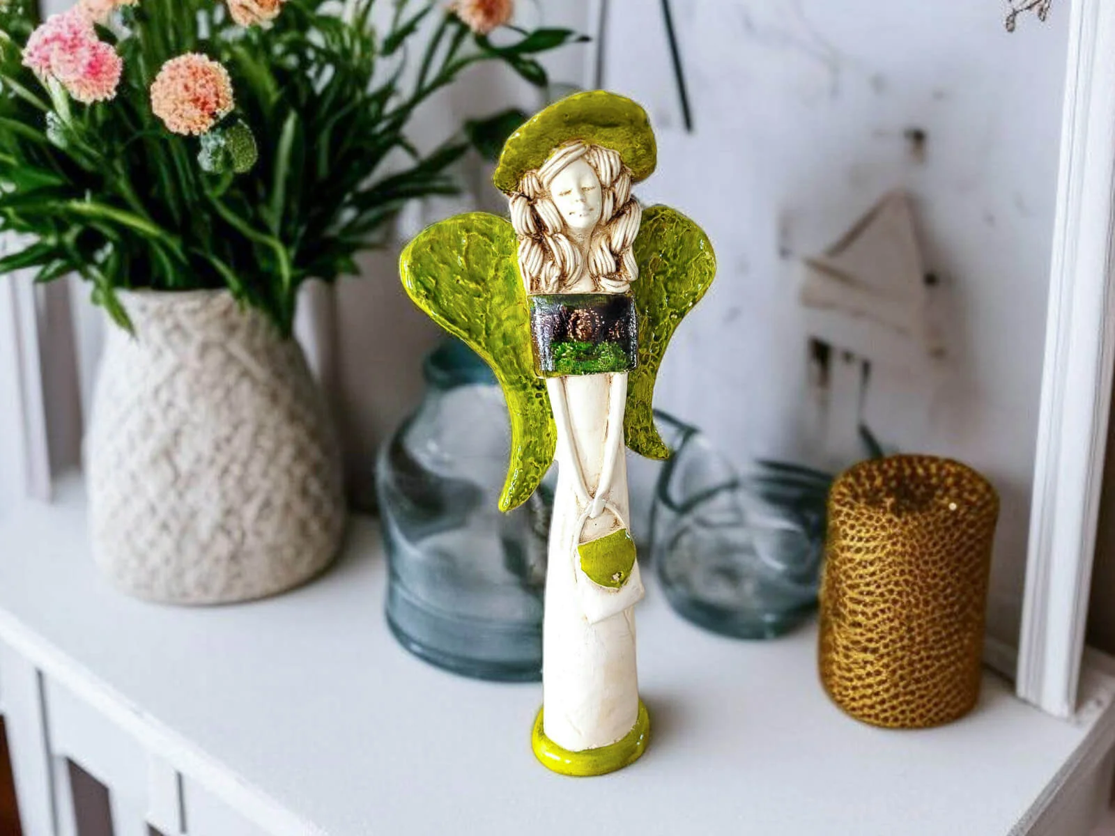 Anioł Coco w unikalnej kolekcji Art Leaf. Coco to ręcznie wykonana figurka gipsowa w kształcie filigranowej dziewczynki. Ma cudowne rozłożyste skrzydła. Jej beżowy ubiór podkreślają kolorowe akcenty z wzorami liści.  Figurka Coco idealnie nadaje się na prezent na dziewczynki lub kobiety jak piękna ozdoba wnosząca do wnętrza dużo pozytywnej energii.