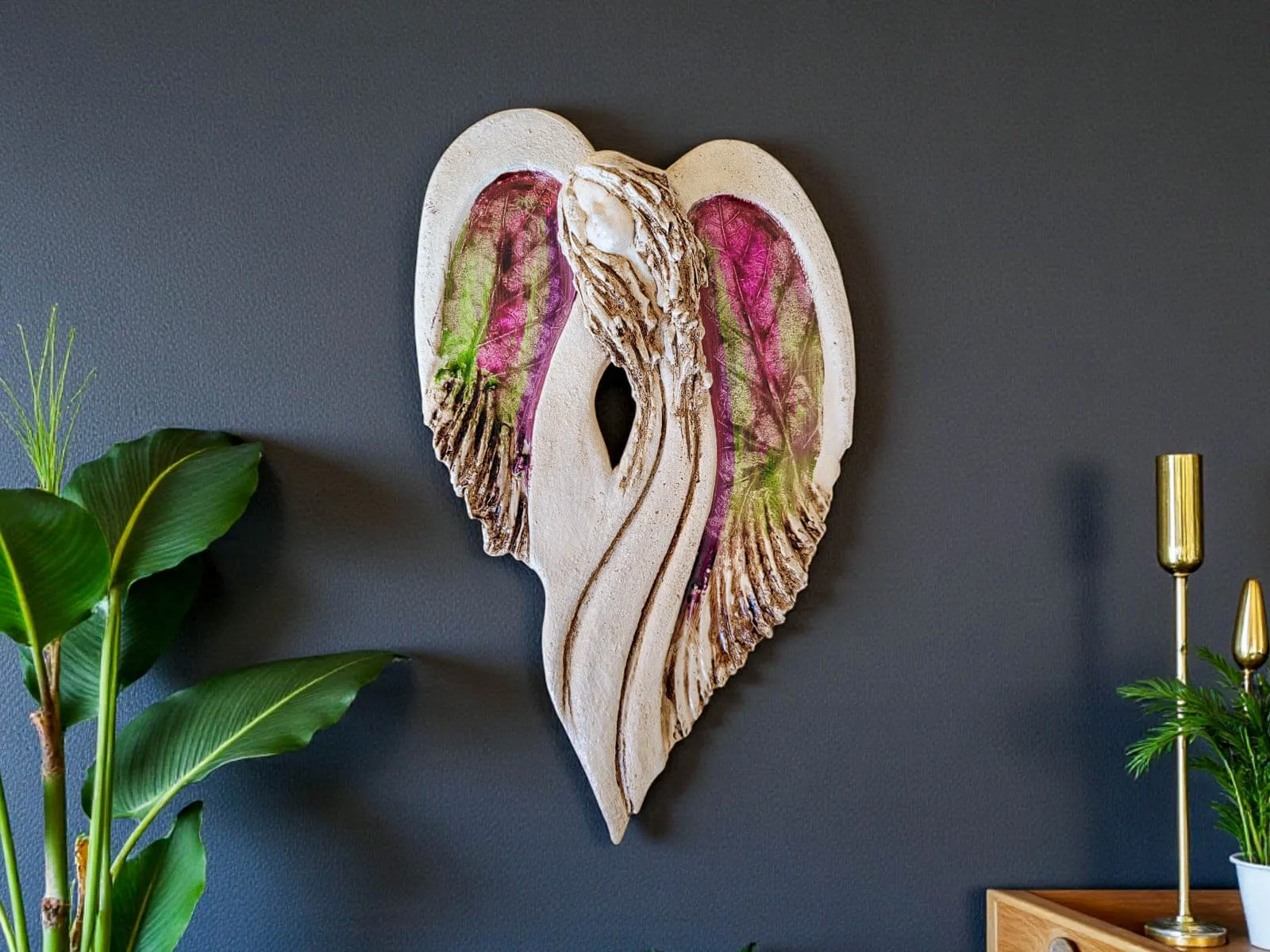 Unikalny anioł Cynthia z kolekcji Art Leaf z wzorami prawdziwych liści. Jedyna sztuka z tym wzorem. Wyjątkowa uroda, ujmująca delikatność, wielka wrażliwość, kwintesencja kobiecości, pełna miłości, porywająca, a jednocześnie zapewniająca spokój. Zobacz jak pięknie chroni miłość, jak dba i troszczy się o Ciebie i Twoich bliskich, opiekuje, obdarza wiarą dającą siłę, rozlewa radość do każdego zakątka mieszkania, przepełnia je dobrocią, sercem pełnym nadziei, sprawia, że miłość dwojga ludzi jest spokojną przystanią.