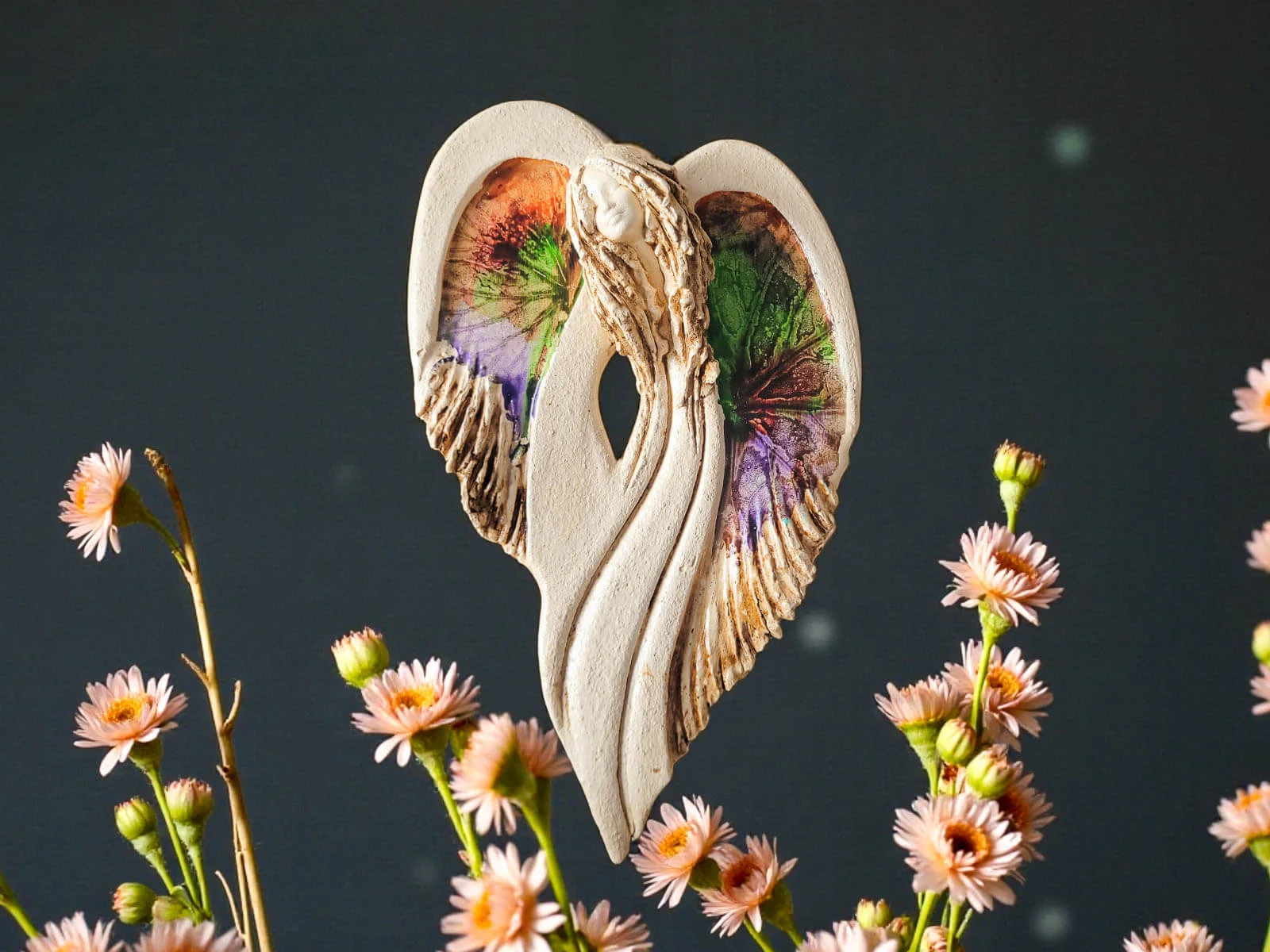 Unikalny anioł Cynthia z kolekcji Art Leaf z wzorami prawdziwych liści. Jedyna sztuka z tym wzorem. Wyjątkowa uroda, ujmująca delikatność, wielka wrażliwość, kwintesencja kobiecości, pełna miłości, porywająca, a jednocześnie zapewniająca spokój. Zobacz jak pięknie chroni miłość, jak dba i troszczy się o Ciebie i Twoich bliskich, opiekuje, obdarza wiarą dającą siłę, rozlewa radość do każdego zakątka mieszkania, przepełnia je dobrocią, sercem pełnym nadziei, sprawia, że miłość dwojga ludzi jest spokojną przystanią.