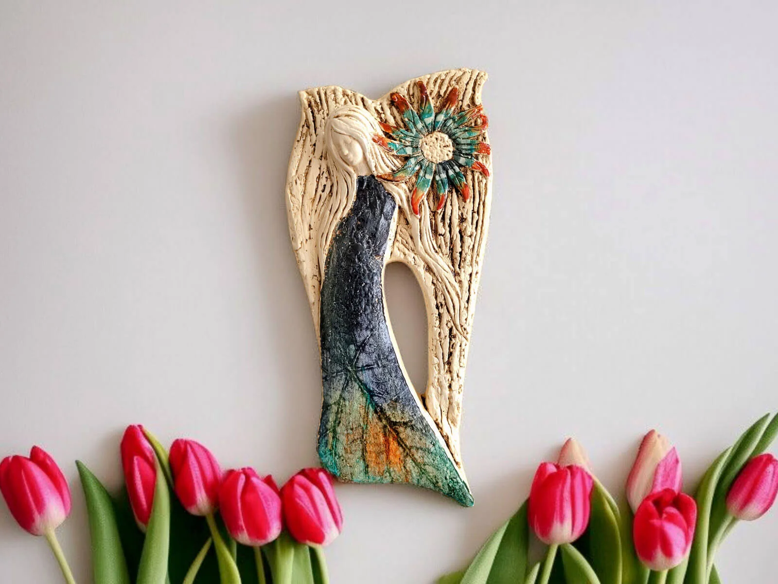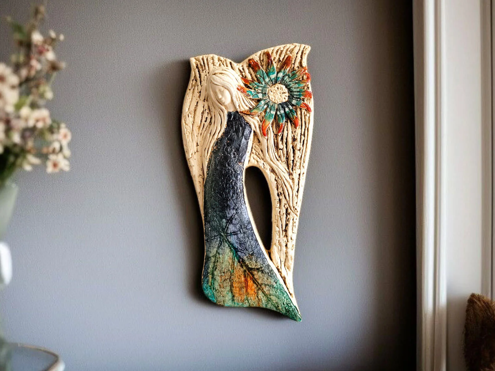 Anioł Xenylla w wersji Art z liśćmi, w granatowej sukni do powieszenia. Wyjątkowa uroda, ujmująca delikatność, wielka wrażliwość, kwintesencja kobiecości, pełna miłości, porywająca, a jednocześnie zapewniająca spokój. Zobacz jak pięknie chroni miłość, jak dba i troszczy się o Ciebie i Twoich bliskich, opiekuje, obdarza wiarą dającą siłę, rozlewa radość do każdego zakątka mieszkania, przepełnia je dobrocią, sercem pełnym nadziei, sprawia, że miłość dwojga ludzi jest spokojną przystanią.