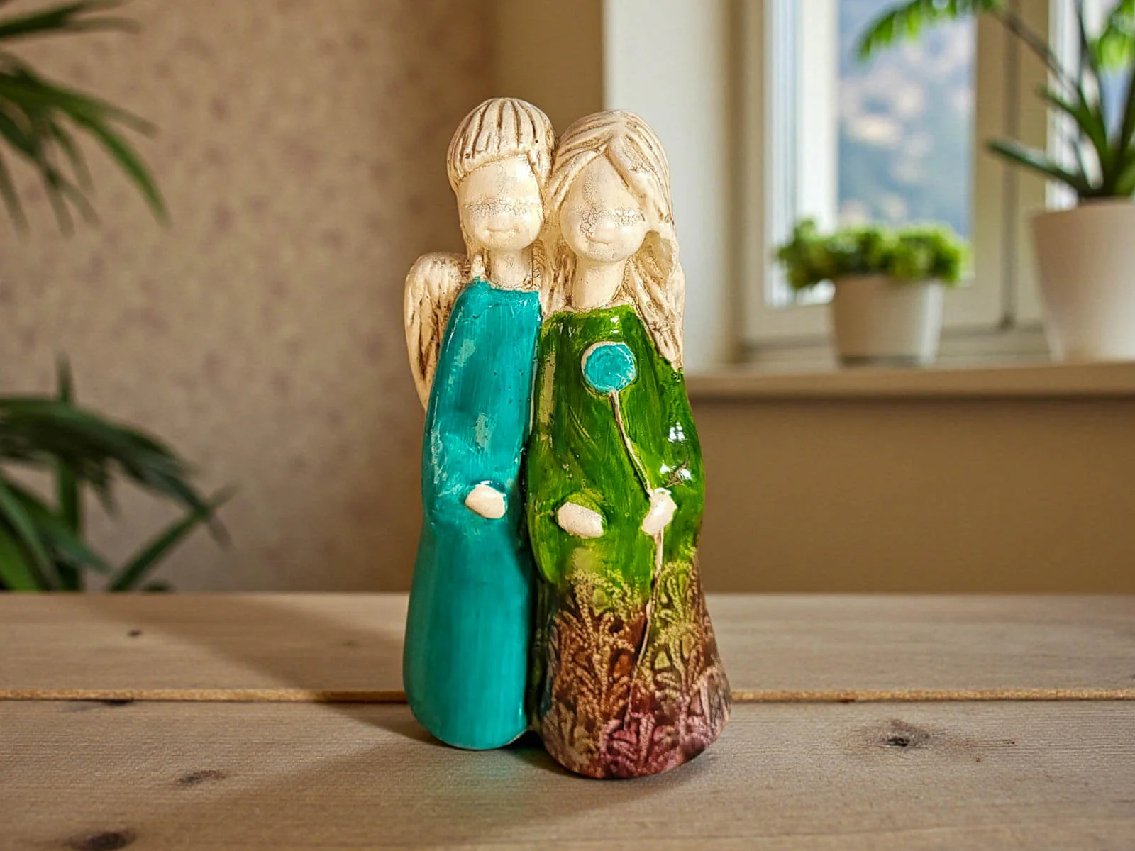 Ręcznie robiona figurka aniołów Apple & Ella, będącą częścią unikalnej kolekcji Art Laef. Ta piękna figurka, utrzymana w barwach zieleni i pomarańczy, wyróżnia się niezwykłym detalem – prawdziwymi liśćmi wkomponowanymi w jej projekt, co nadaje jej naturalnego i wyjątkowego uroku.