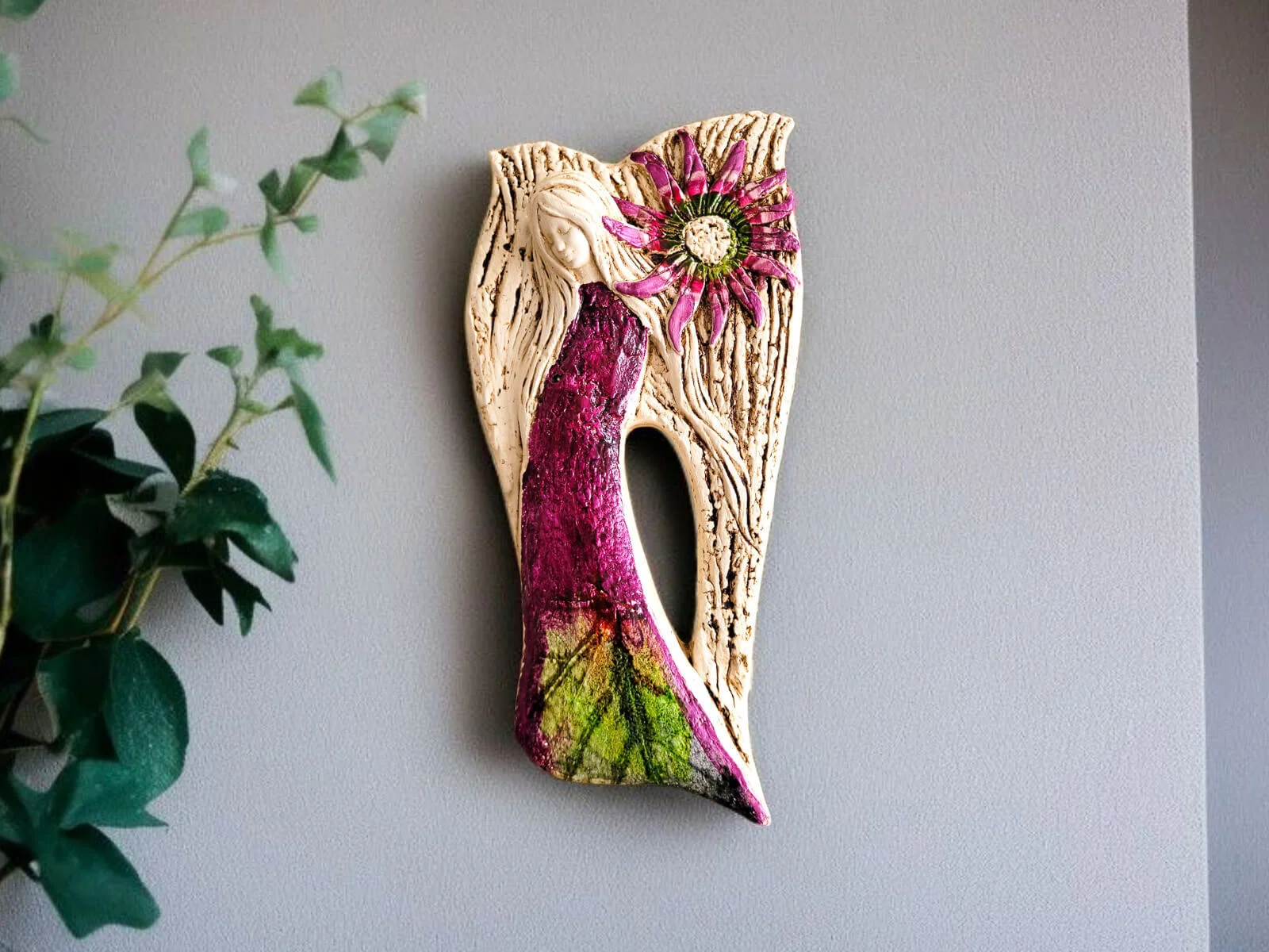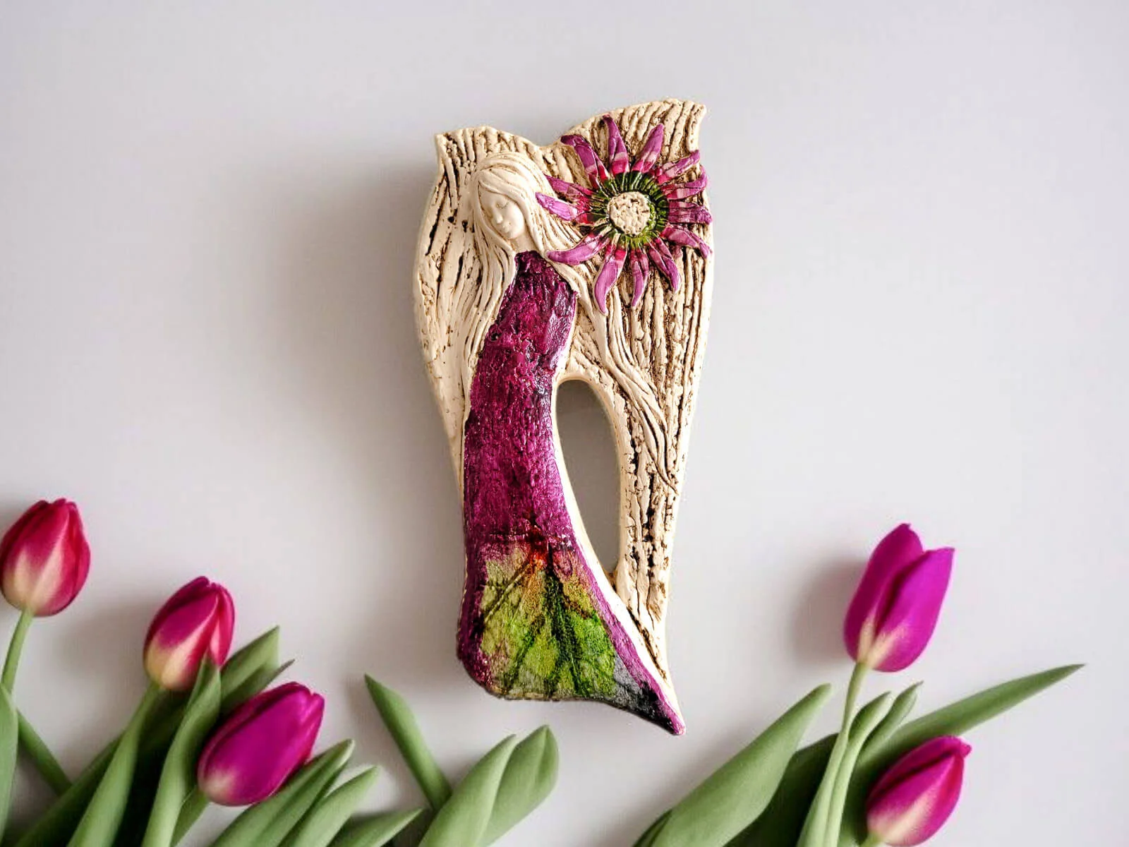 Anioł Xenylla w wersji Art z liśćmi, w fioletowej sukni do powieszenia. Wyjątkowa uroda, ujmująca delikatność, wielka wrażliwość, kwintesencja kobiecości, pełna miłości, porywająca, a jednocześnie zapewniająca spokój. Zobacz jak pięknie chroni miłość, jak dba i troszczy się o Ciebie i Twoich bliskich, opiekuje, obdarza wiarą dającą siłę, rozlewa radość do każdego zakątka mieszkania, przepełnia je dobrocią, sercem pełnym nadziei, sprawia, że miłość dwojga ludzi jest spokojną przystanią.
