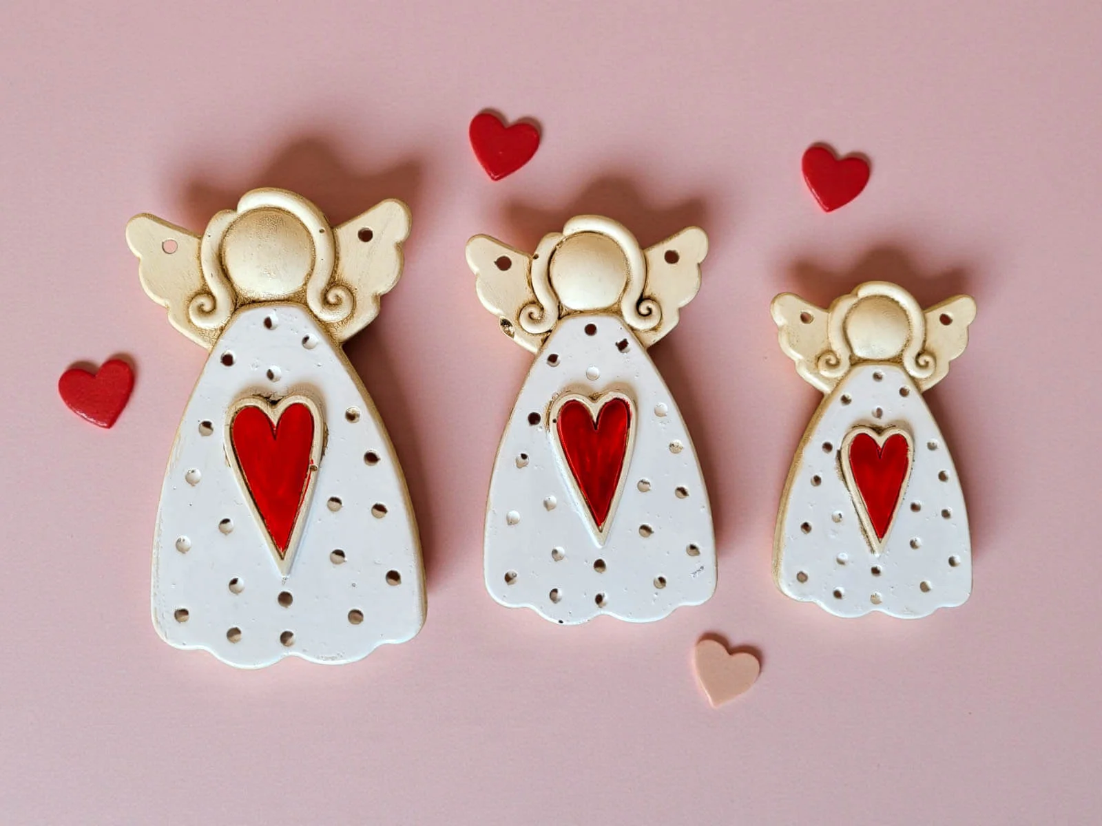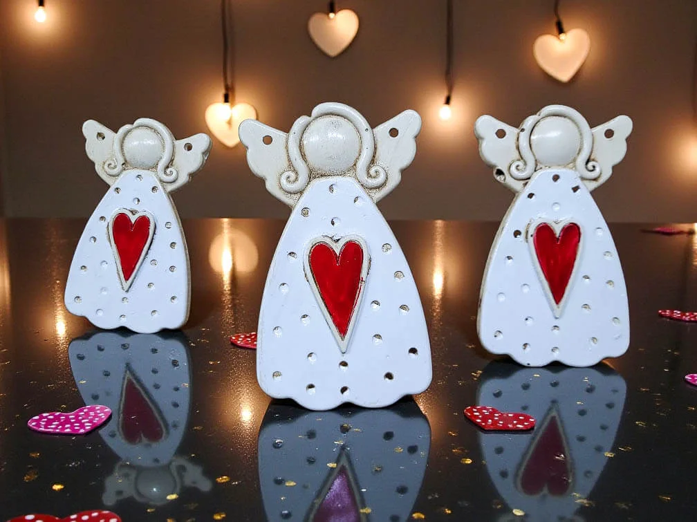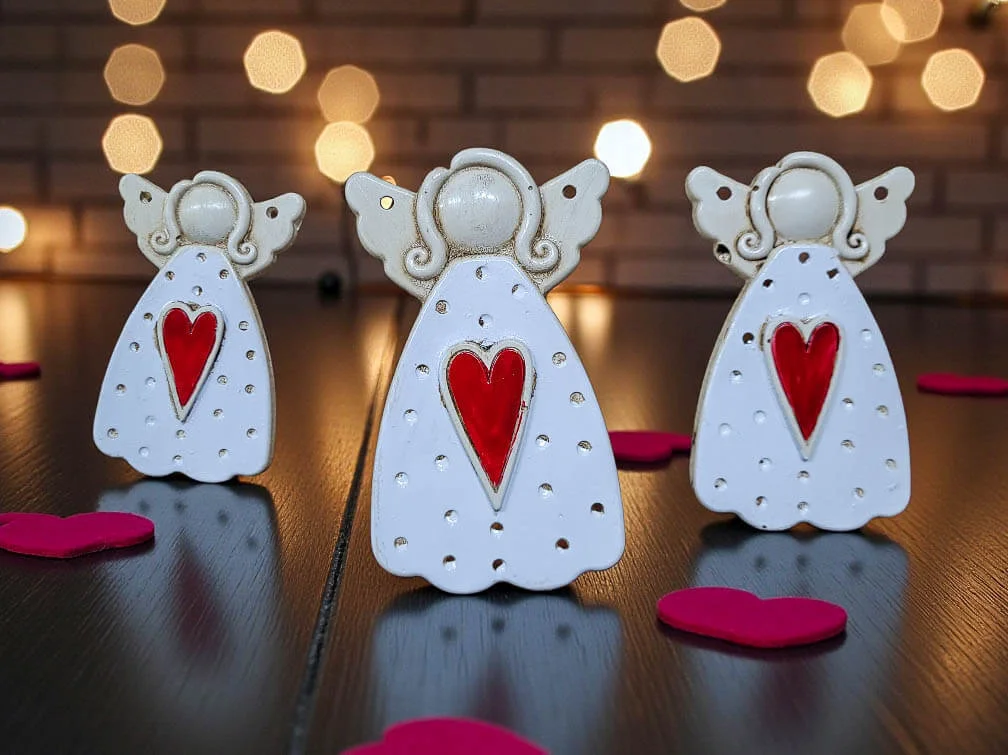 Komplet trzech białych aniołków z czerwonym sercem na piersi to coś więcej niż dekoracja — to gest pełen czułości i znaczenia. Każdy z nich został ręcznie wykonany i malowany w Polsce, dzięki czemu zestaw ma unikatowy charakter i duszę, którą czuć od pierwszego spojrzenia.