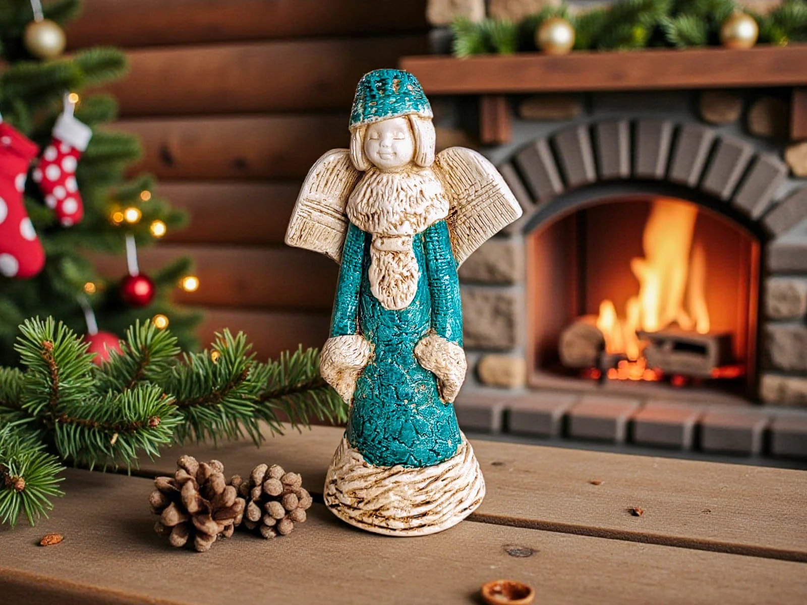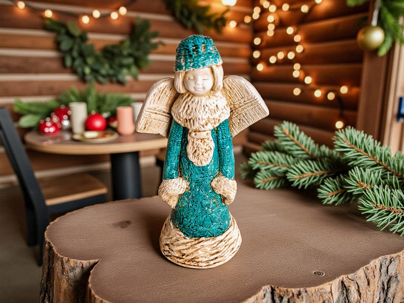 Aniołek Naya została utrzymana w harmonijnym połączeniu kolorów czerwonego, białego i turkusu, które nadają jej radosny, zimowy i bardzo świąteczny klimat. Delikatne detale, precyzyjne zdobienia i miękkie linie figurki sprawiają, że przyciąga wzrok od pierwszego spojrzenia.