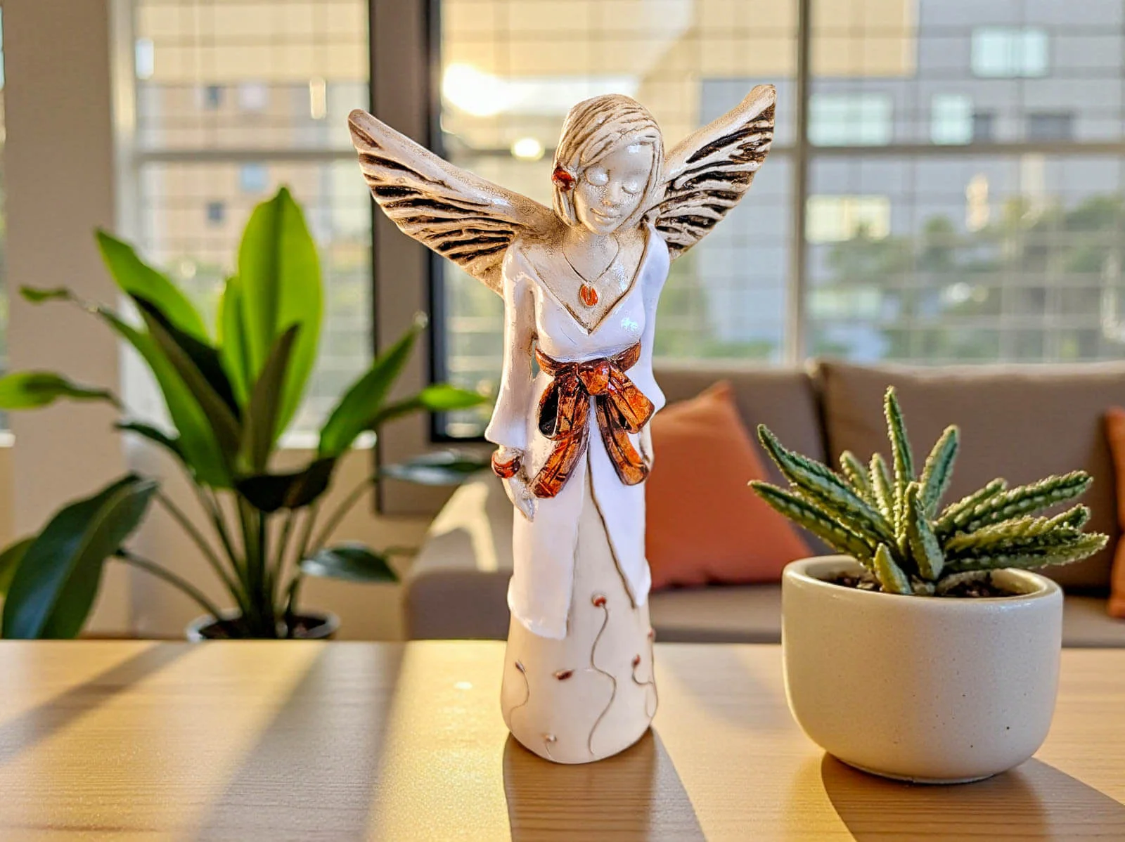 Jeśli anioł ma zostać wręczony jako prezent możemy go również elegancko zapakować w przeźroczysty celofan wiązany ekologicznym sznurkiem. Dzięki temu anioł będzie wyglądał jeszcze bardziej dostojnie i będzie gotowy do wręczenia. Dla wygody możesz również od razu zakupić papierową białą torbę prezentową.