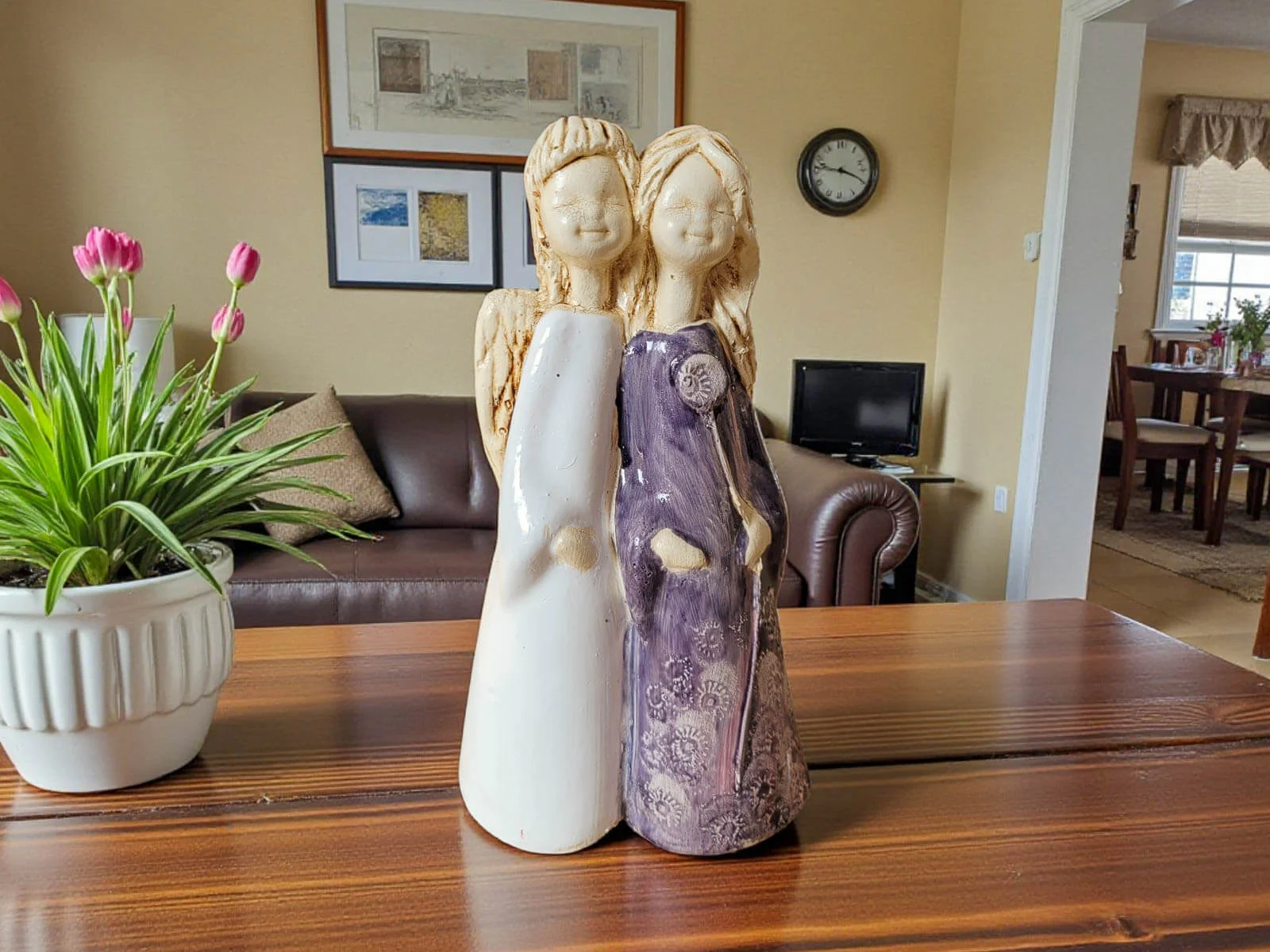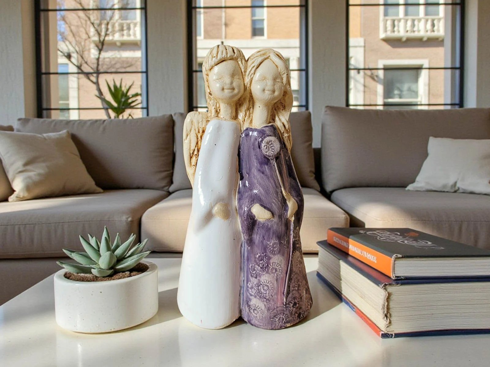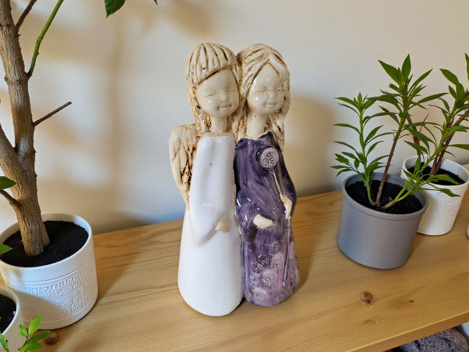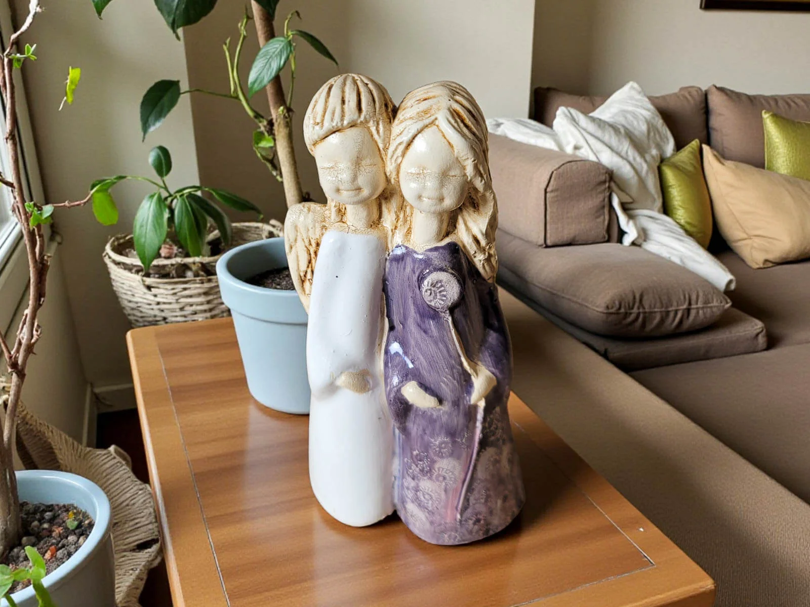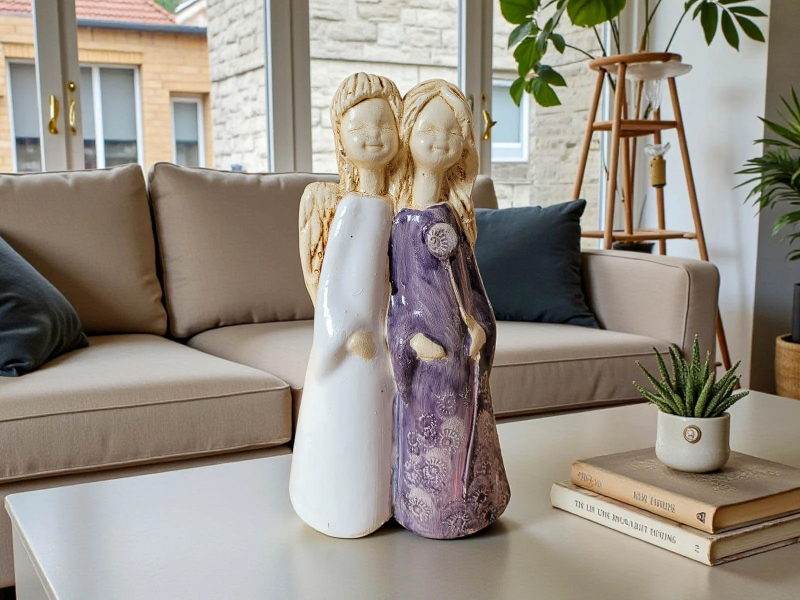 Aniołki Apple i Ella z kolekcji Art to ręcznie wykonane figurki w białym i szarym, stalowym kolorze z delikatnymi wzorkami, które natychmiast przyciągają wzrok. Maleńkie aniołki trzymają się za ręce i uśmiechają, tworząc obraz bliskości i radości.