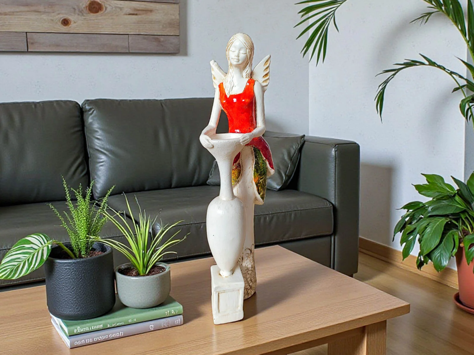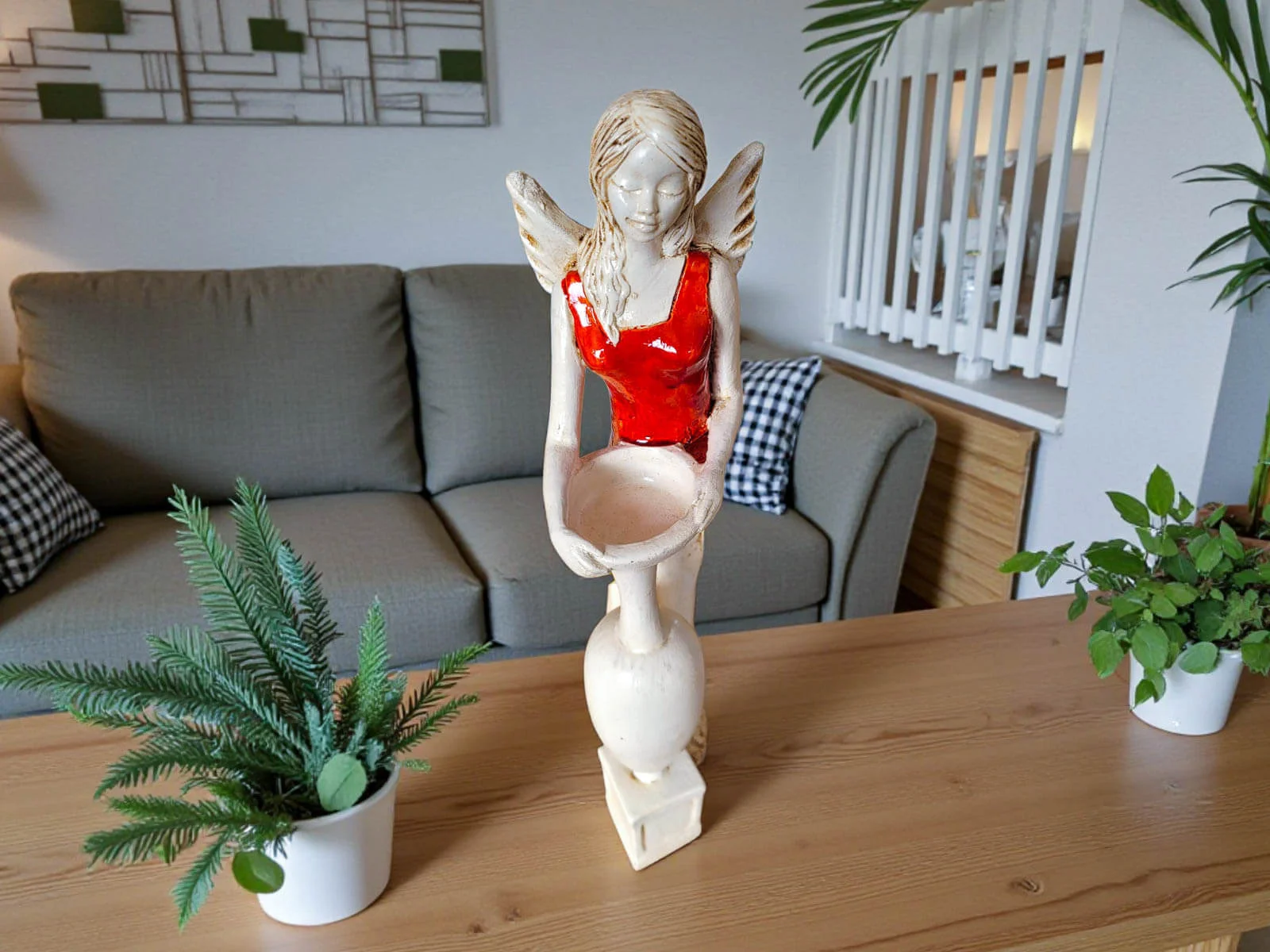 Jeśli anioł ma zostać wręczony jako prezent możemy go również elegancko zapakować w przeźroczysty celofan wiązany ekologicznym sznurkiem. Dzięki temu anioł będzie wyglądał jeszcze bardziej dostojnie i będzie gotowy do wręczenia. Dla wygody możesz również od razu zakupić papierową białą torbę prezentową.