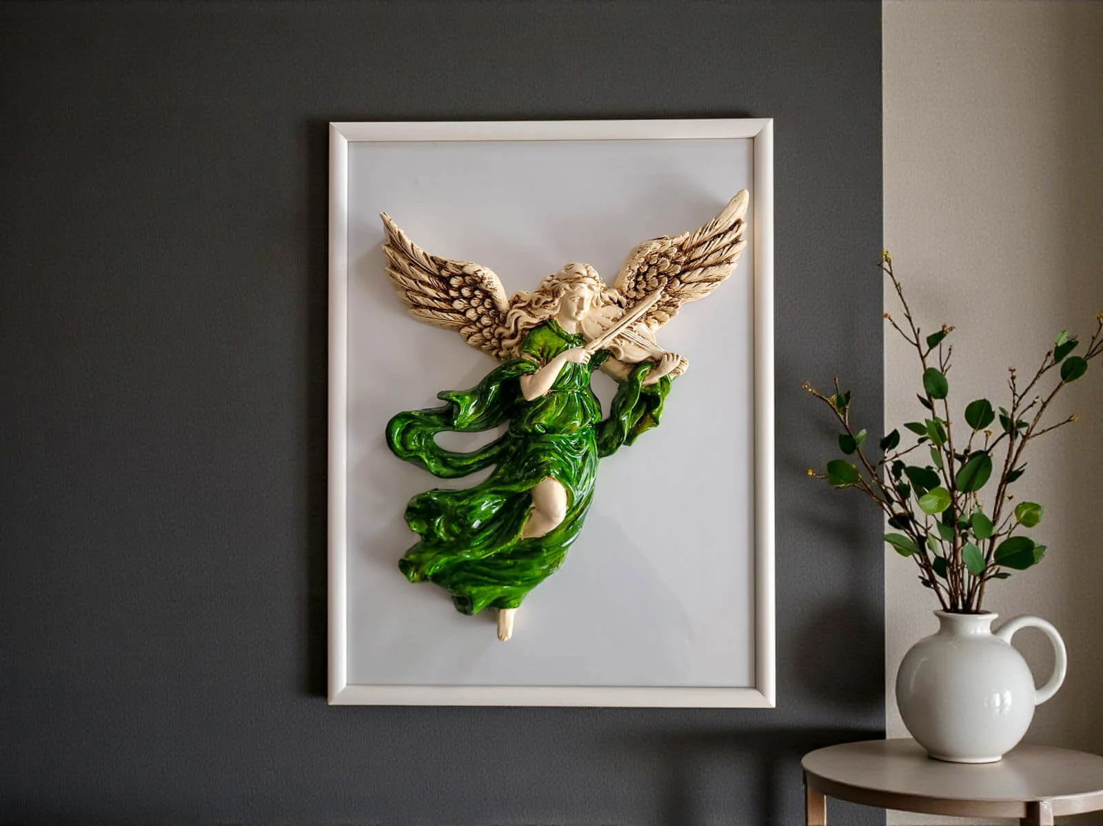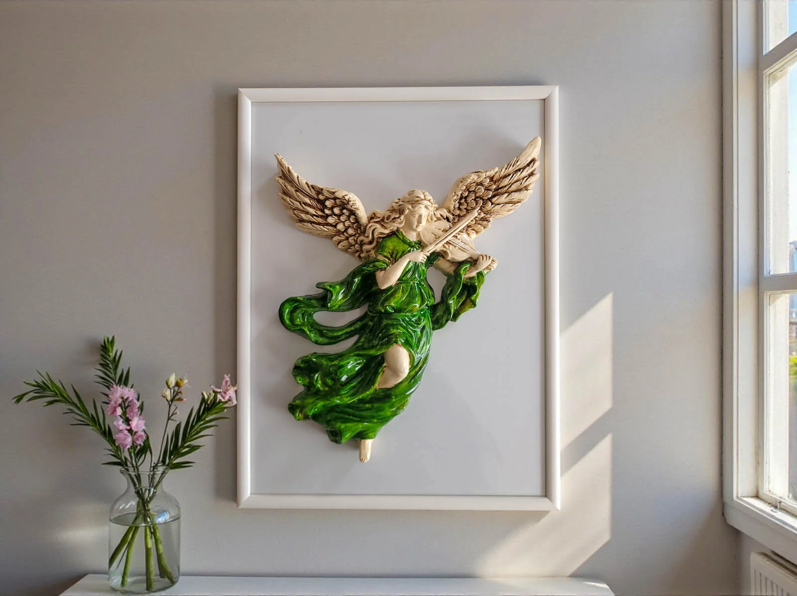 Anioł ze Skrzypcami z elegancką drewnianą białą ramką to unikatowa, ręcznie robiona figurka do powieszenia na ścianie dzięki której wnętrze Twojego domu nabierze niepowtarzalnego uroku. Każdy element figurki emanuje starannością, tradycją i artystycznym kunsztem.