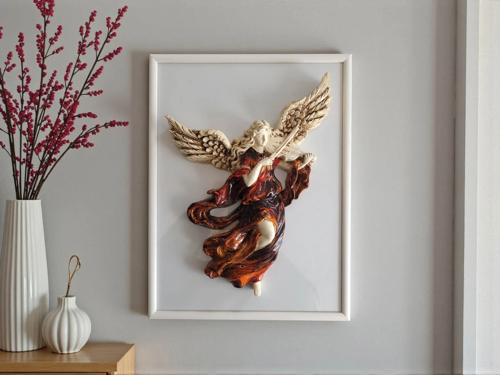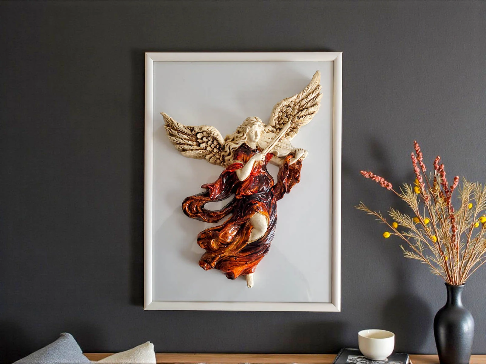 Anioł ze Skrzypcami w jasnobrązowej sukni z elegancką drewnianą ramką to unikatowa, ręcznie robiona figurka do powieszenia na ścianie dzięki której wnętrze Twojego domu nabierze niepowtarzalnego uroku. Każdy element figurki emanuje starannością, tradycją i artystycznym kunsztem.