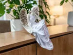 Jeśli anioł ma zostać wręczony jako prezent możemy go również elegancko zapakować w przeźroczysty celofan wiązany ekologicznym sznurkiem. Dzięki temu anioł będzie wyglądał jeszcze bardziej dostojnie i będzie gotowy do wręczenia. Dla wygody możesz również od razu zakupić papierową białą torbę prezentową.