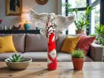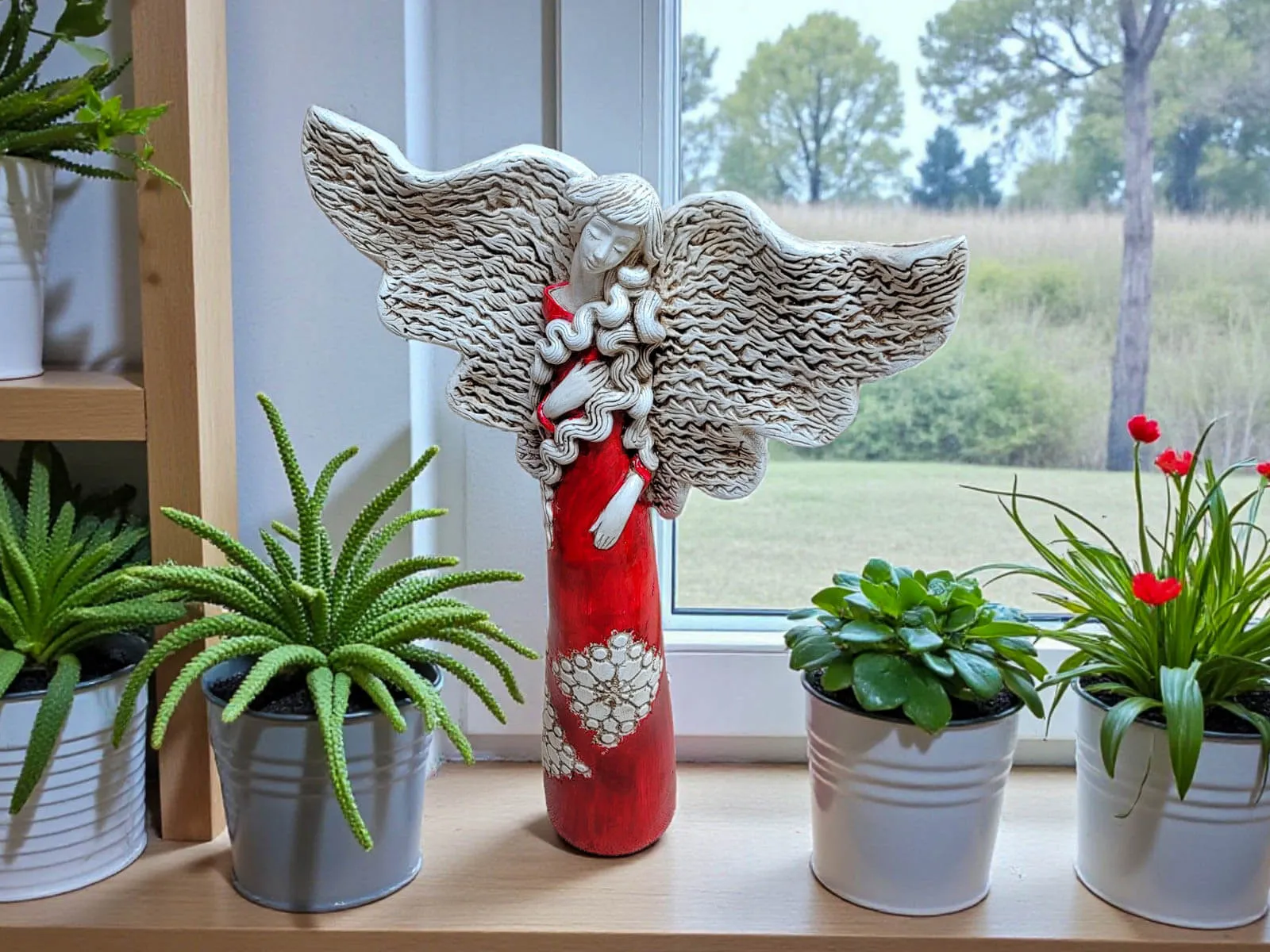 Anioł Dorothy w czerwonej sukni to wyjątkowa figurka, która przyciąga spojrzenia elegancją i ciepłą, pełną emocji formą. Jej rozłożyste skrzydła, delikatny gest dłoni i pochylona głowa nadają całości spokojny, refleksyjny charakter, który wprowadza do wnętrza atmosferę harmonii, wdzięczności i nadziei.
