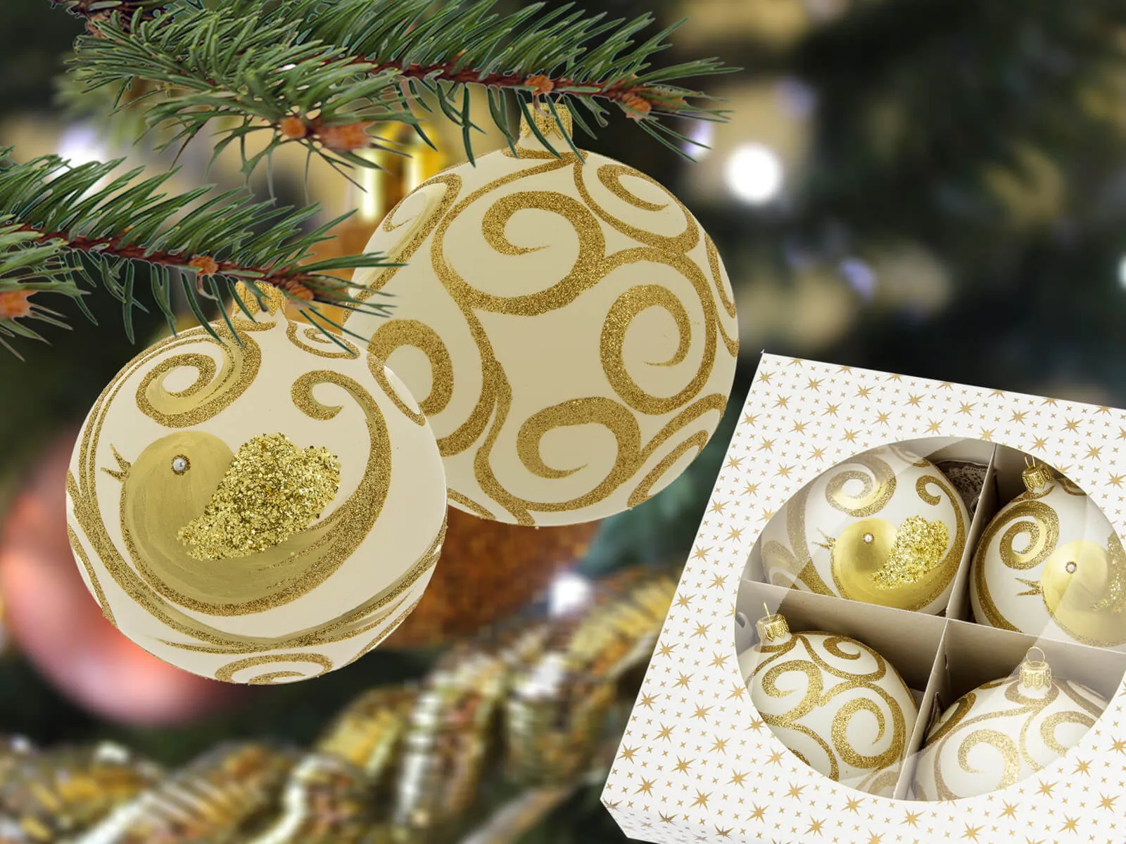 Przepiękne bombki!!! Najładniejsza ozdoba mojej choinki!!! Jedyny minus, ważny przy zakupach w sklepie internetowym to brak informacji na paczce, że zawiera elementy szklane. Przesyłka byłaby pewnie bezpieczniejsza w trakcie transportu.